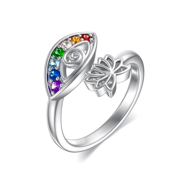 Sterling Silver Cubic Zirconia Lotus & Evil Eye Open Ring