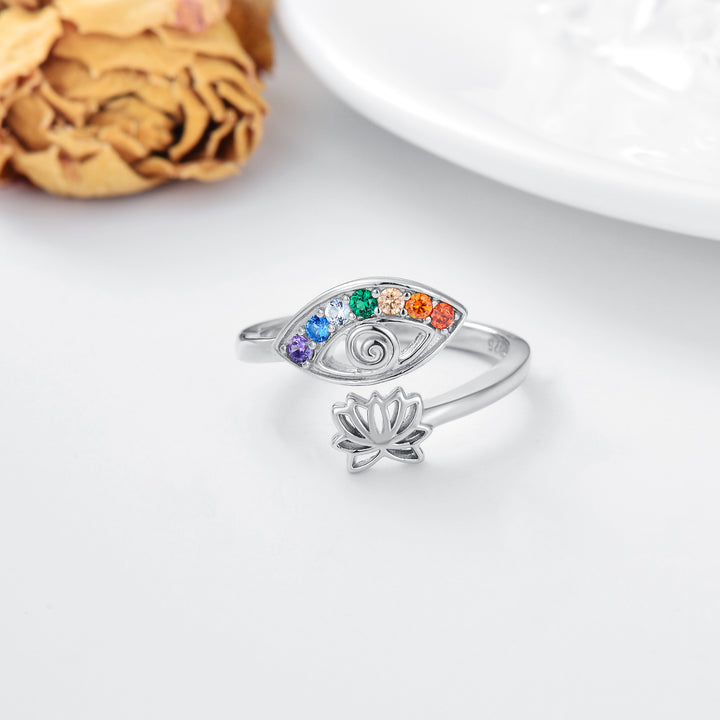 Crafted from Sterling Silver with White Gold Plating, featuring an Open Ring with Cubic Zirconia and a Lotus & Evil Eye Design.