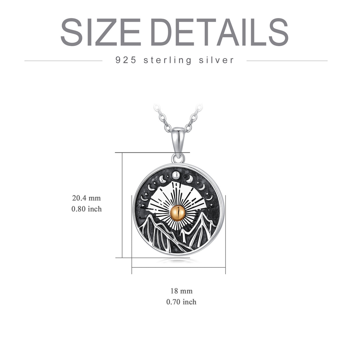 Sterling silver; internal ash compartment; tri-tone moon and mountain design; silver chain.