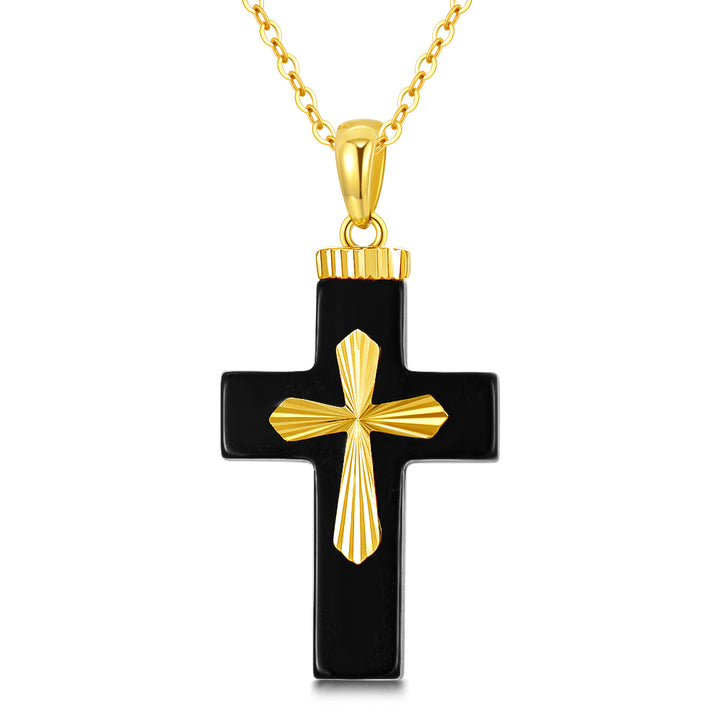 14K Yellow Gold Natural Black Shaped Agate Cross Pendant Necklace