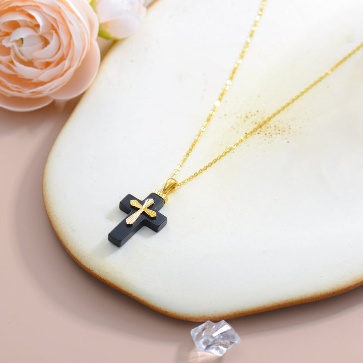 This pendant necklace is crafted from 14K yellow gold and features a striking, smooth-cut natural black agate gemstone set in a cross pendant design, suspended from a matching gold chain.