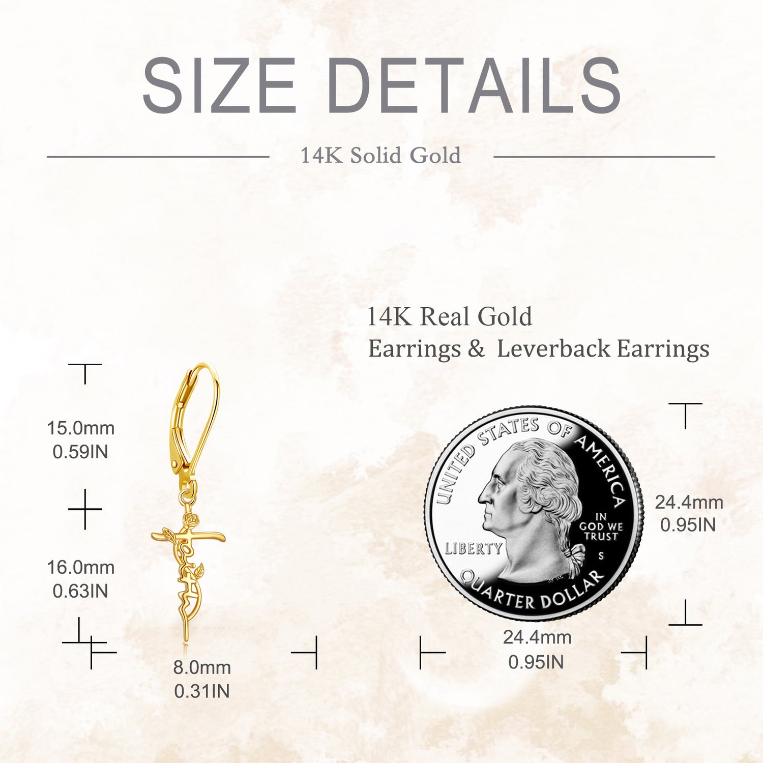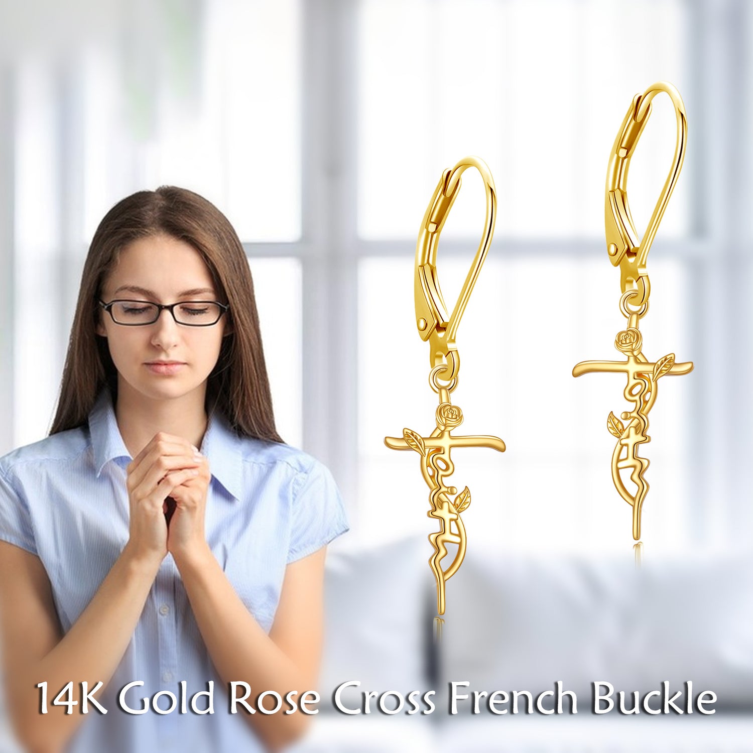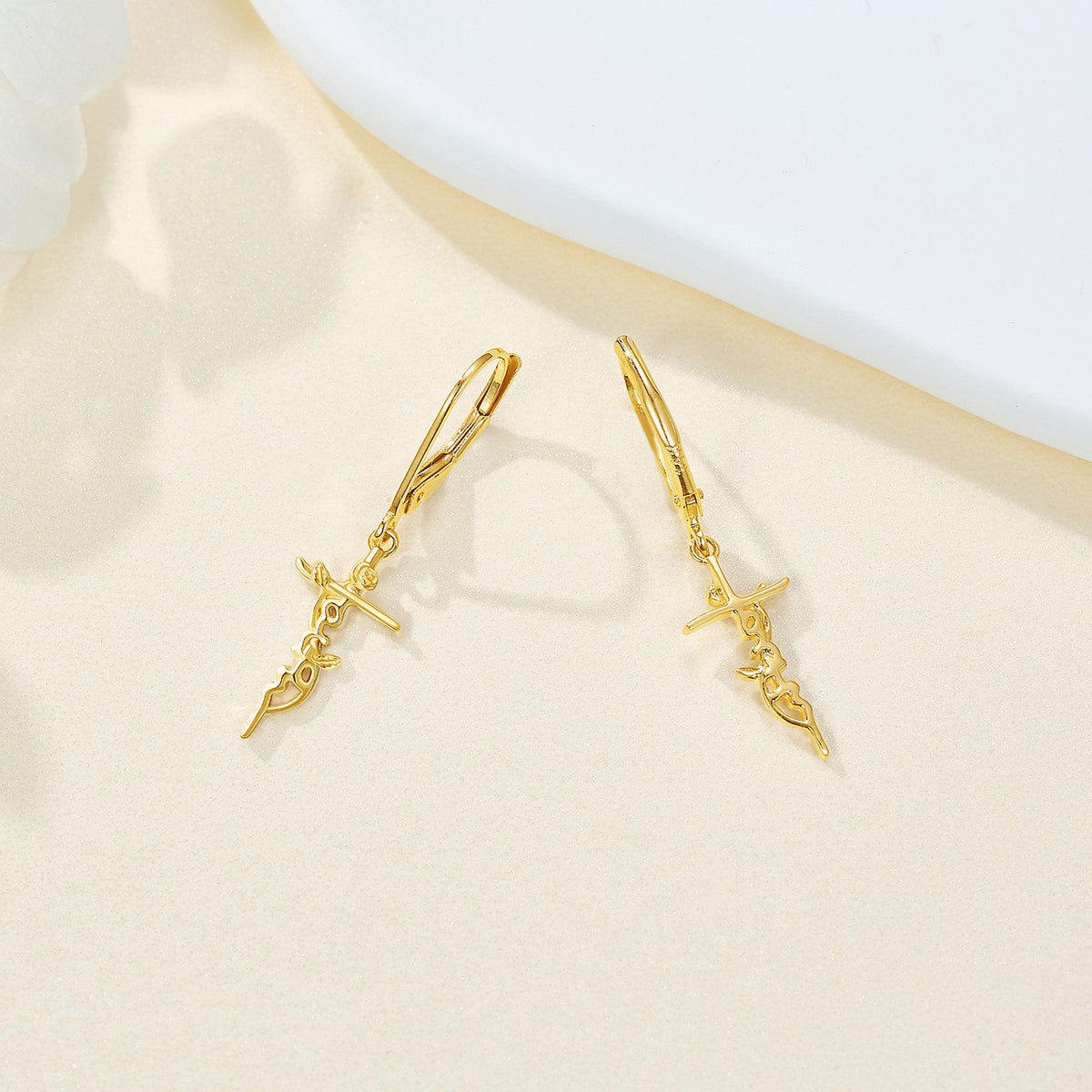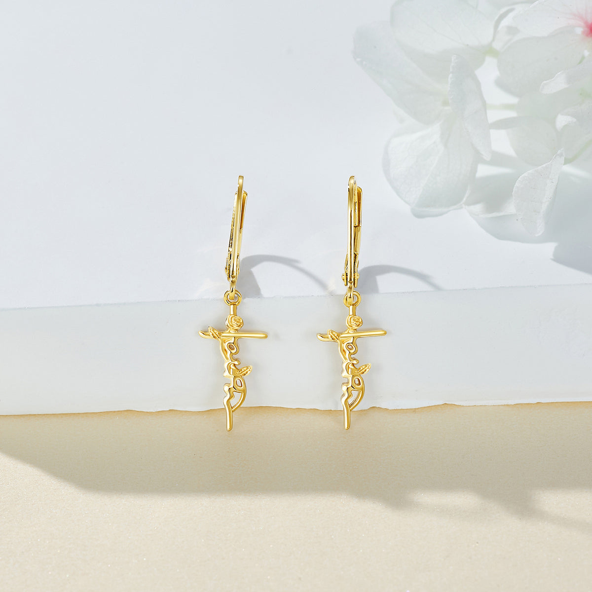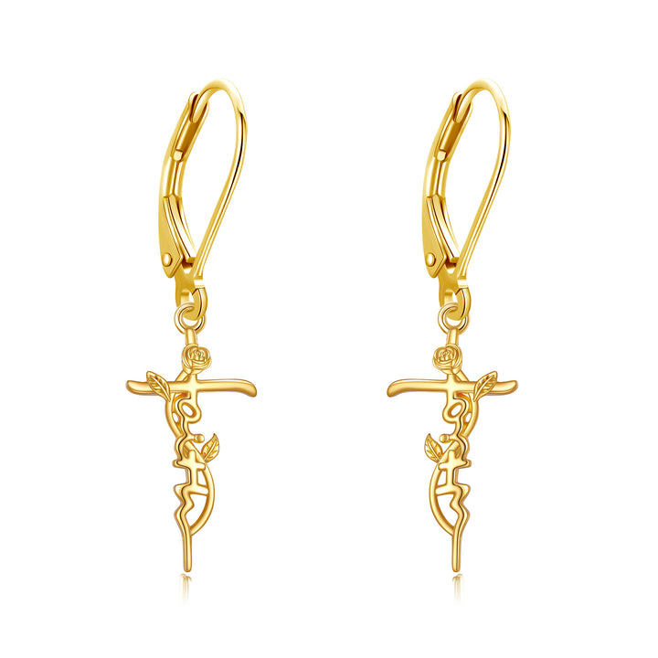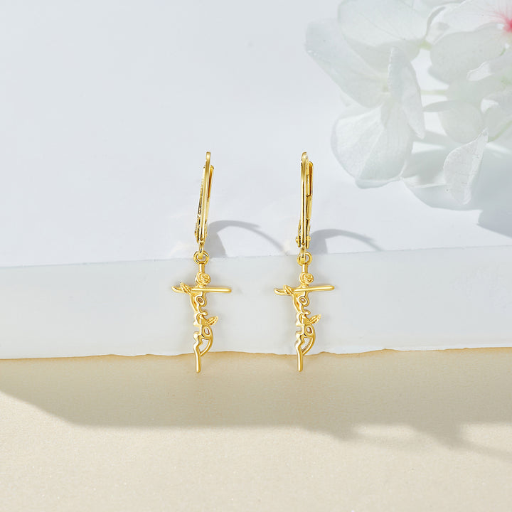 14K Gold Rose & Cross Lever-back Earrings