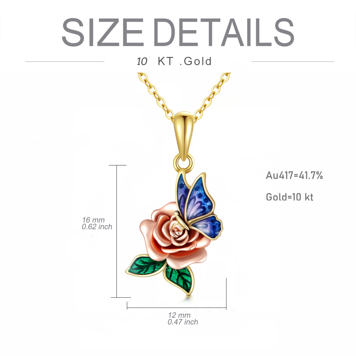 This stone-free Pendant Necklace is crafted from 10K Gold in Gold and Rose Gold finishes, featuring a Butterfly and Rose Motif.