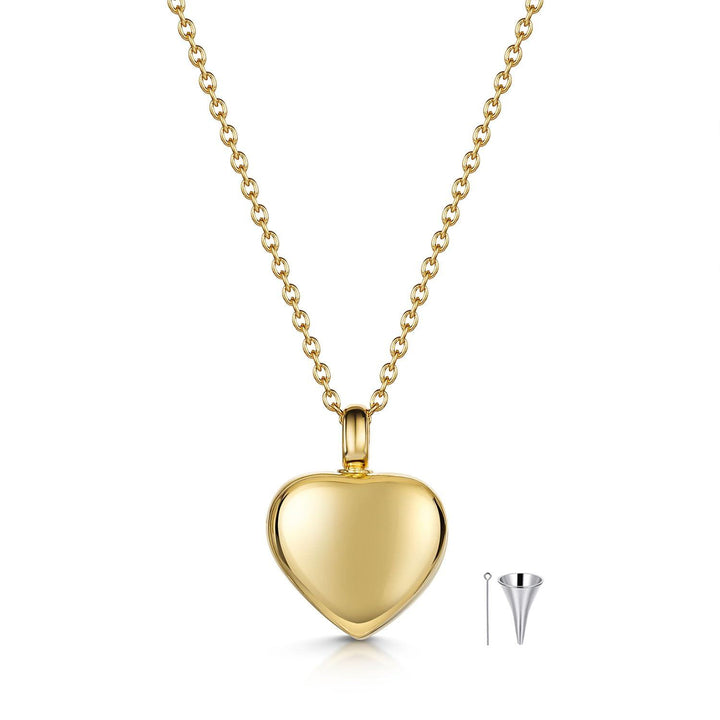10K yellow gold; heart-shaped urn pendant; engravable surface; chain necklace.