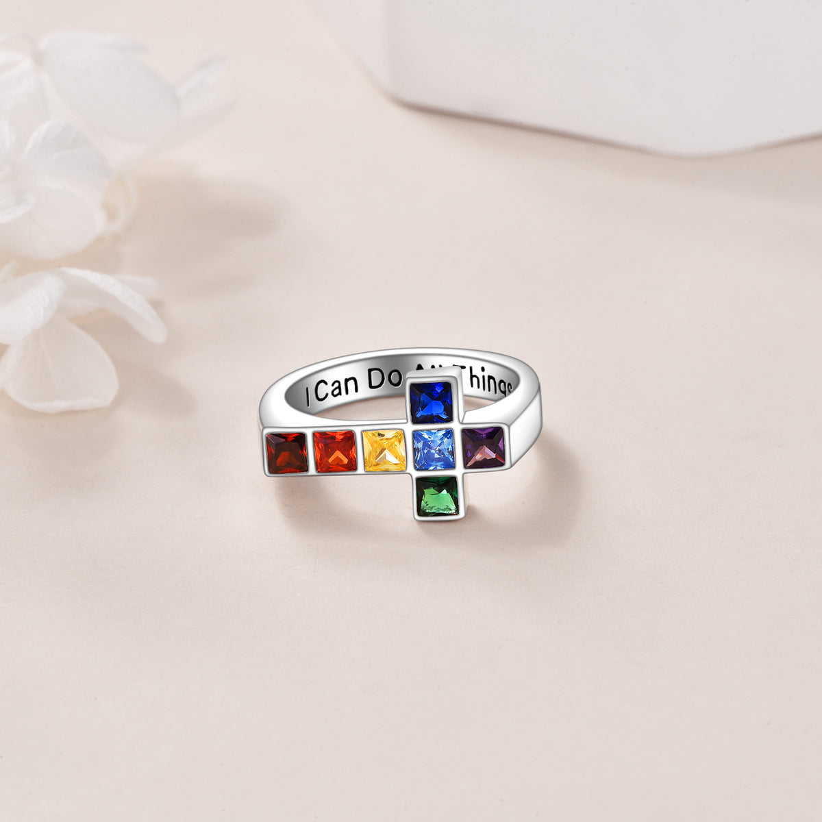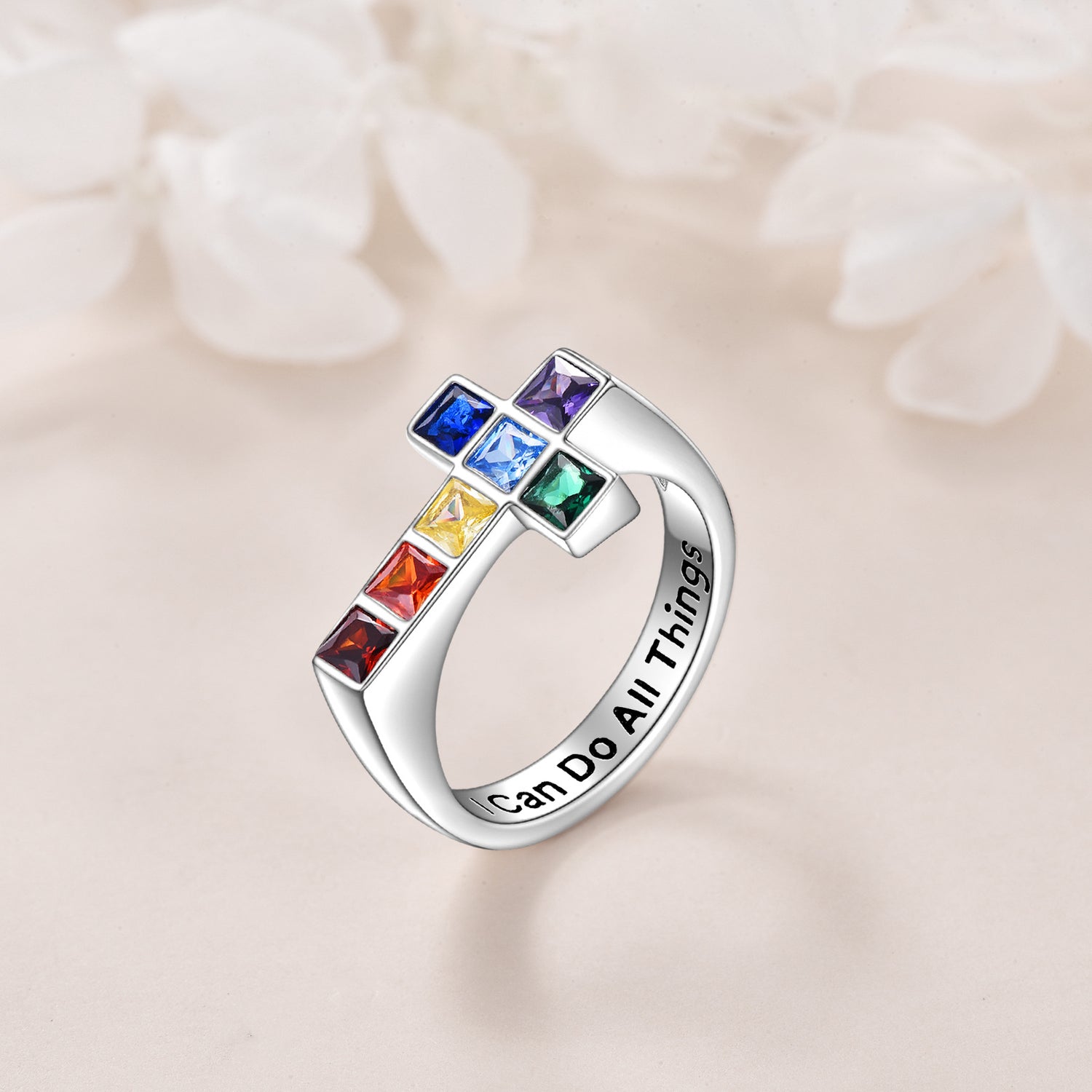 Sterling Silver Cubic Zirconia Chakras & Cross Ring with Engraved Word