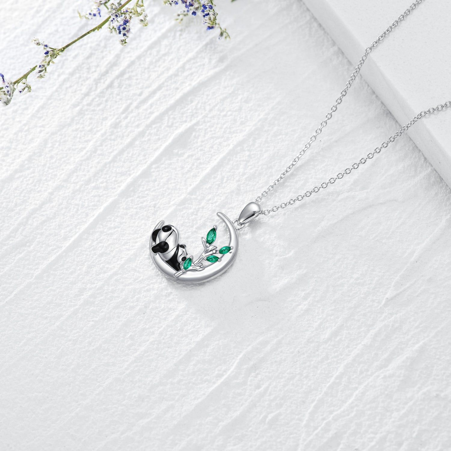 This Pendant Necklace is crafted from Sterling Silver with White Gold Plating, featuring a Stunning Pear-Shaped Emerald Crystal embraced by a Delicate Panda and Moon Design.