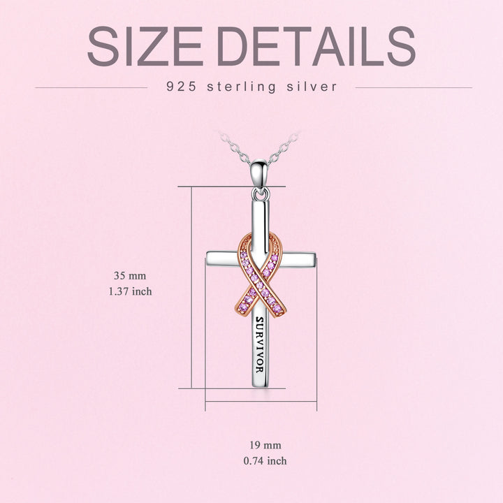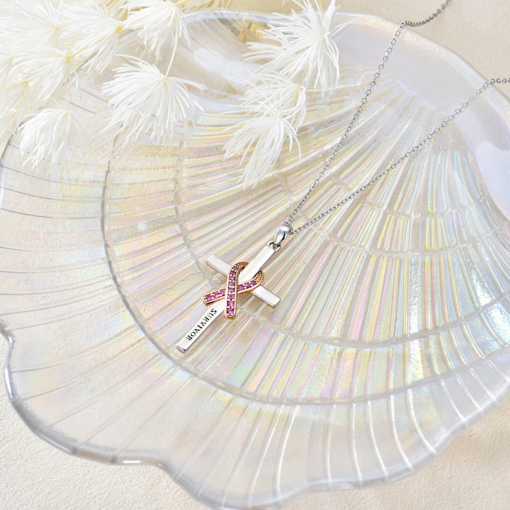 This Sterling Silver Two-tone Circular Shaped Cubic Zirconia Cross & Ribbon Pendant Necklace with Engraved Word by YFN is an exquisite circular-shaped necklace for women, symbolizing resilience and strength. Crafted from Sterling silver with Rose gold hues (Two-tone), it features a Pink cubic zirconia cross nestled within a delicate ribbon design.