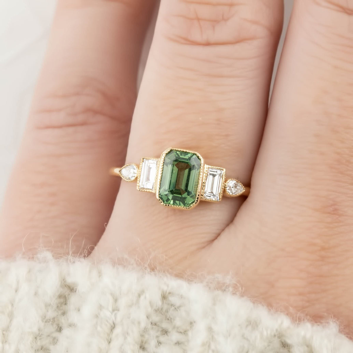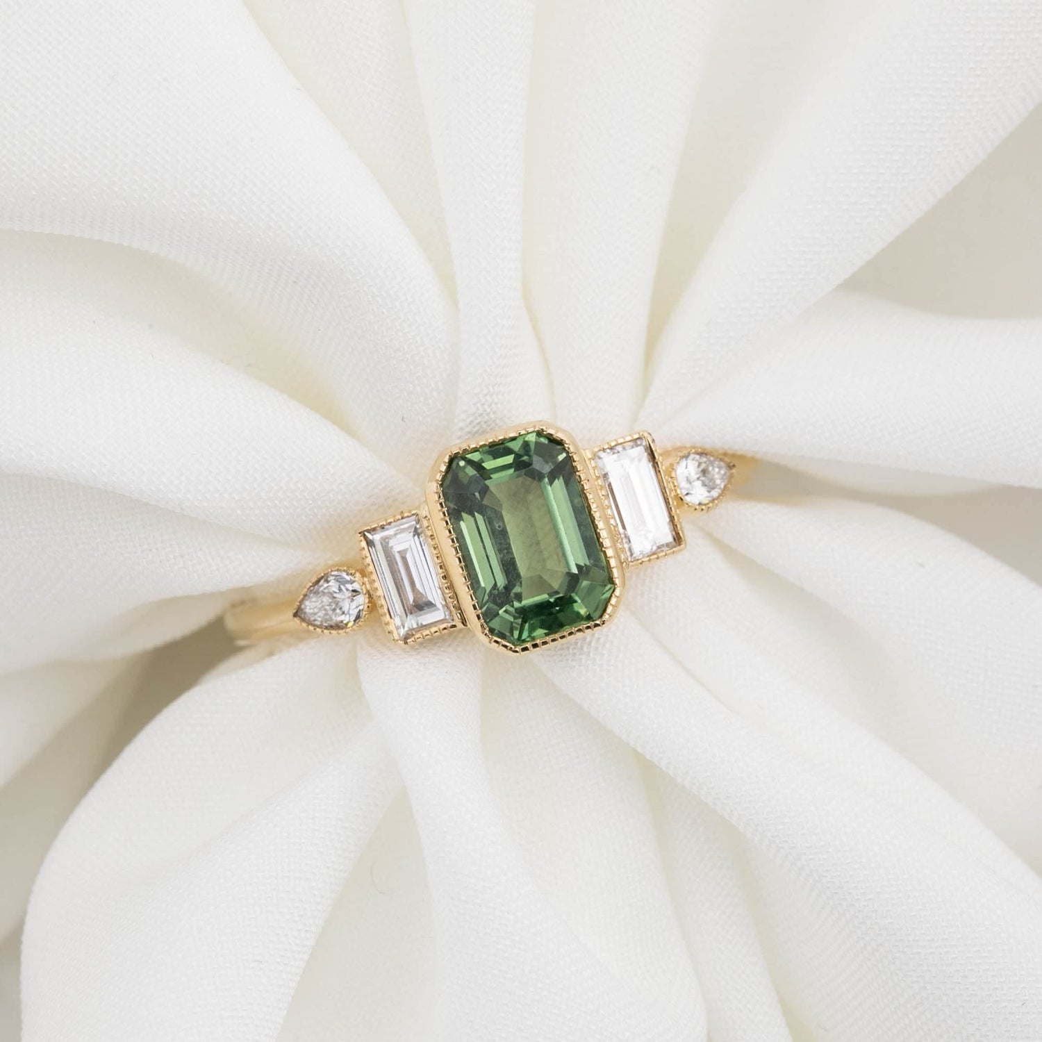 Engagement ring crafted from solid 14K gold, featuring a 1CT radiant cut emerald crystal center stone. Set with baguette and pear cut Moissanite side stones. Available in standard US ring sizes 5 to 10.