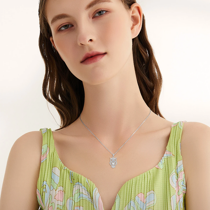Meticulously crafted from 14K Gold with a White Gold setting, this Owl Pendant Necklace features stunning Moissanite gemstones.
