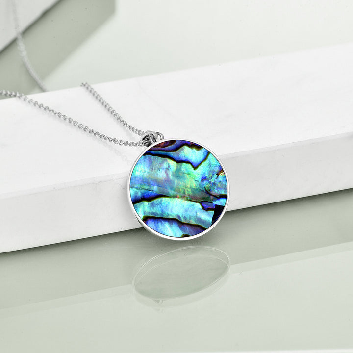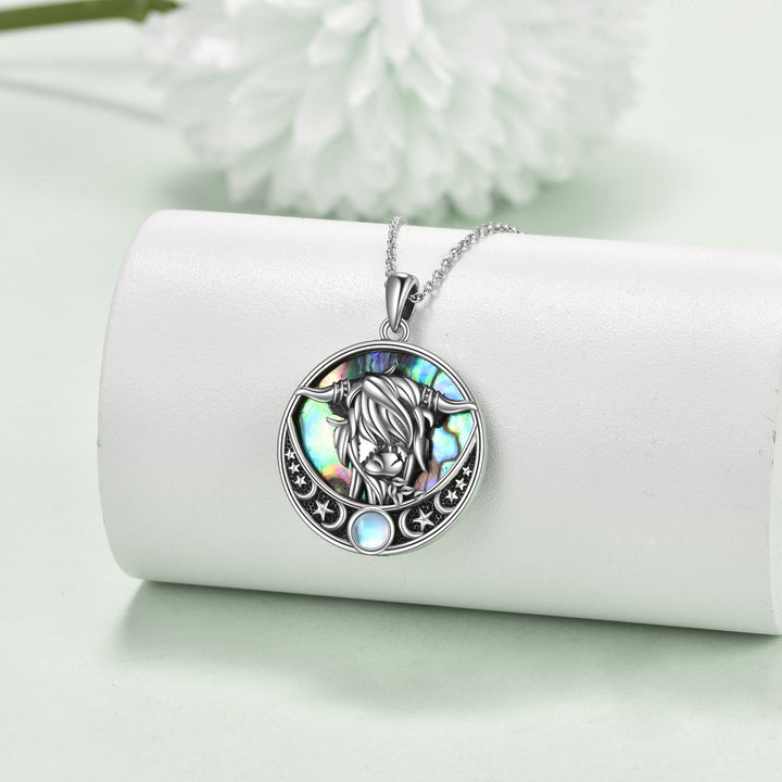 Crafted from Sterling Silver with a Retro Silver Finish, this unisex circular pendant features Abalone Shellfish, Moonstone accents, and Highland Cow, Moon, and Star motifs.