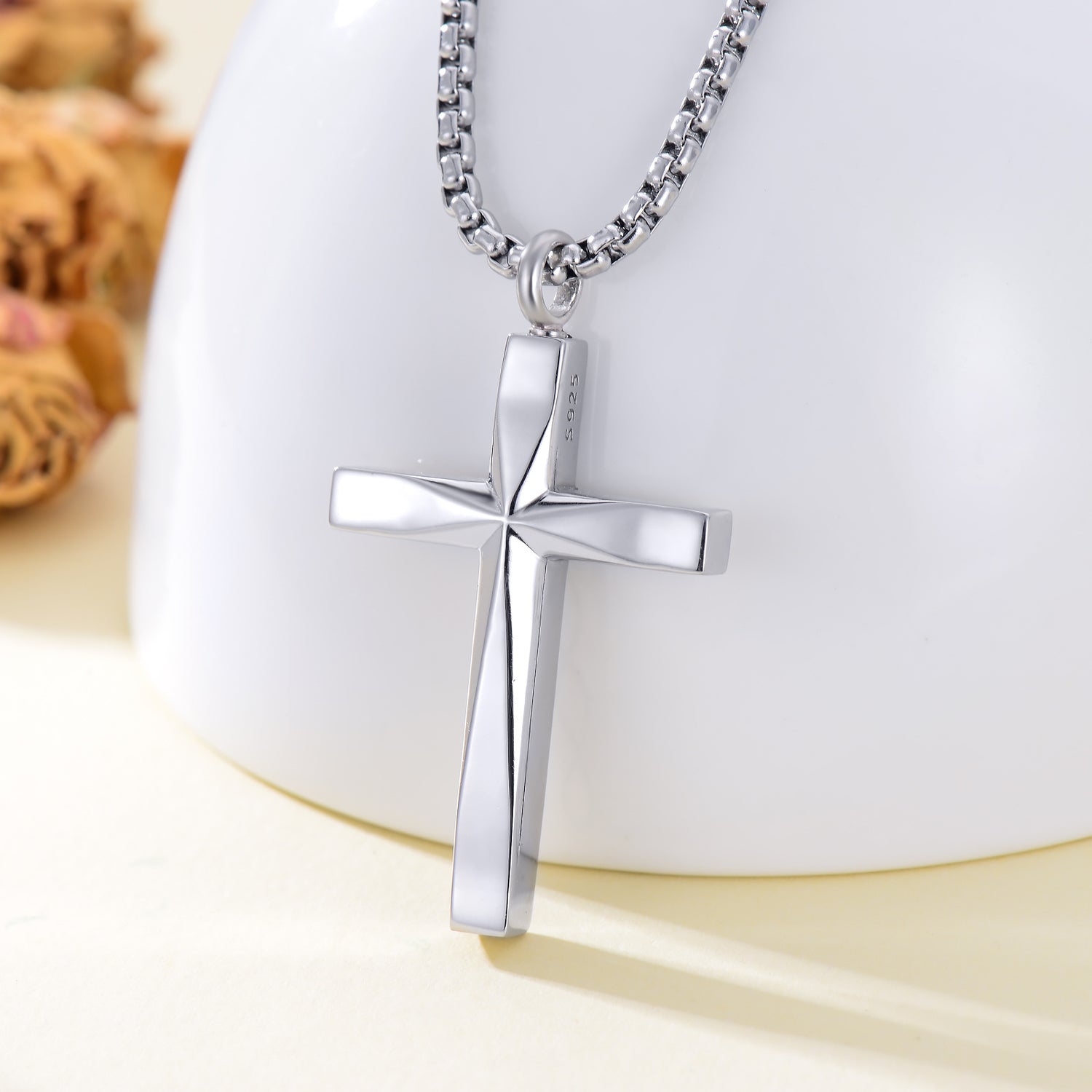 This Cross & Infinity Symbol Urn Necklace for Ashes with Engraved Word by YFN is a deeply meaningful and versatile unisex memorial piece. The combination of the cross and the infinity symbol, beautifully designed and plated in white gold, symbolizes eternal love and remembrance. With the heartfelt engraving "Always In My Heart," this minimalist, no-stone urn necklace provides a subtle yet powerful way to keep a loved one's memory close, offering comfort and timeless sophistication for everyday wear.