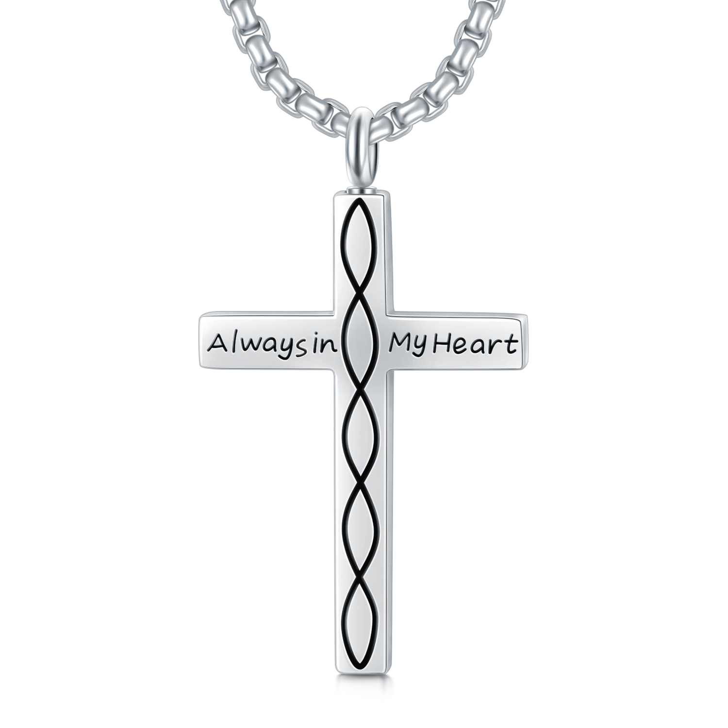This unisex urn necklace is crafted from sterling silver with white gold plating. It features a cross and infinity symbol motif and is engraved with "Always In My Heart." It contains no stones.