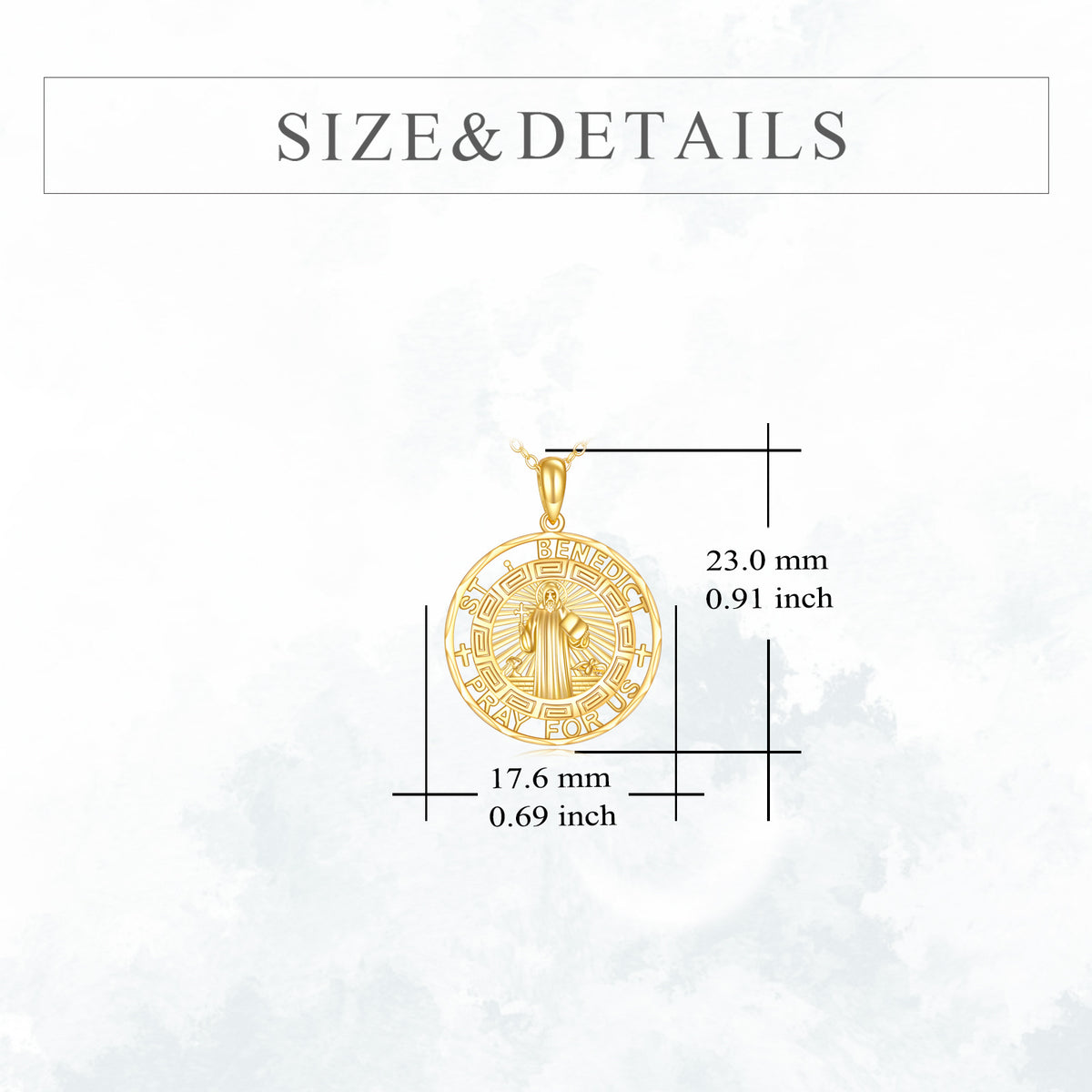 Crafted in solid 14K gold. Features engraved St. Benedict Medal pendant. Adjustable matching chain with secure clasp.