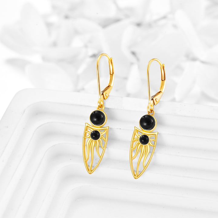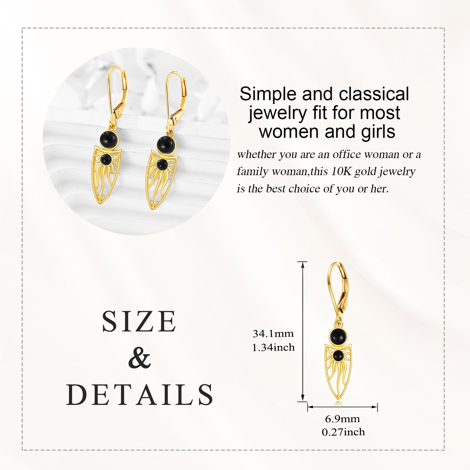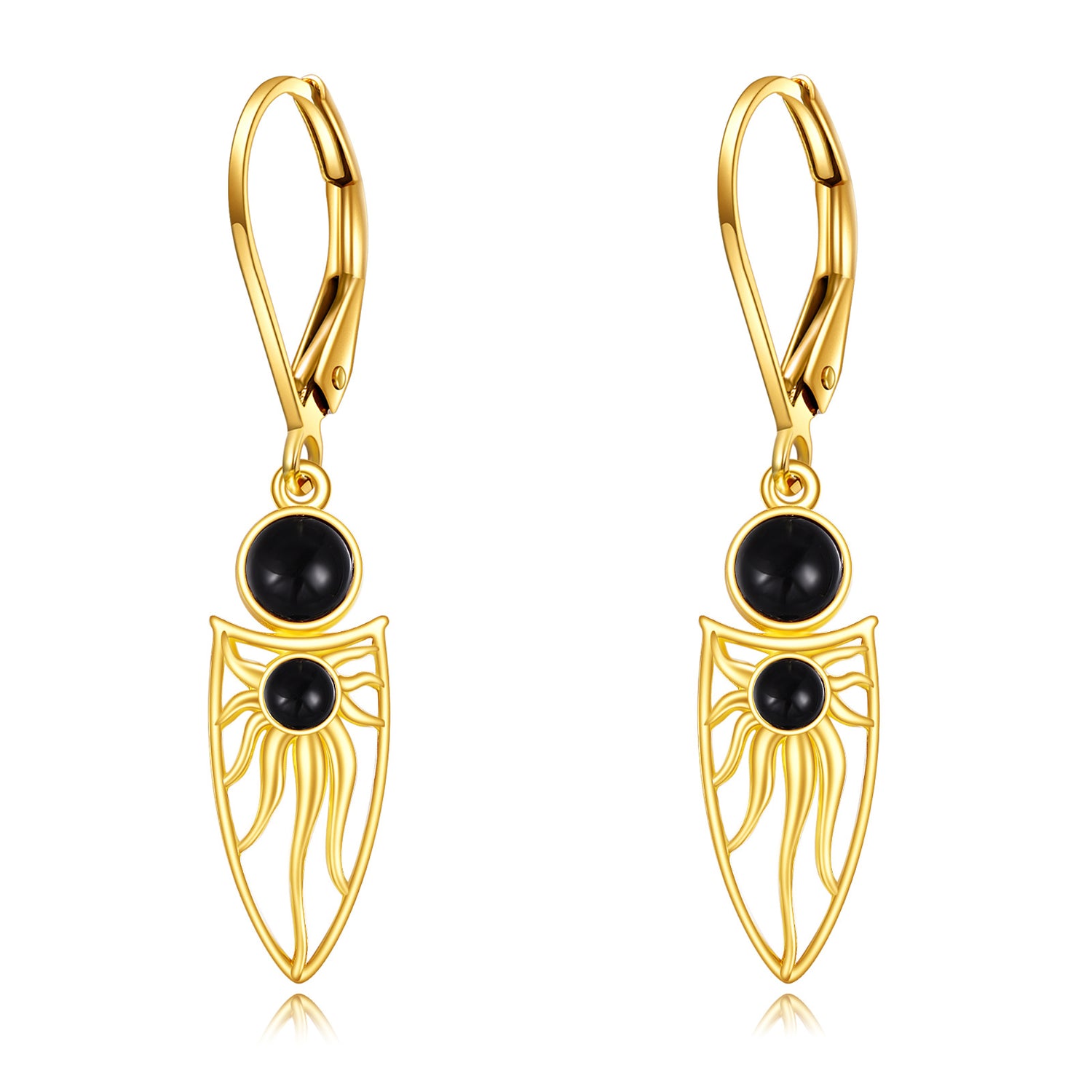 Crafted in 10K gold with natural or dyed agate stones. Sun-inspired drop design. Stone size and earring measurements per manufacturer.