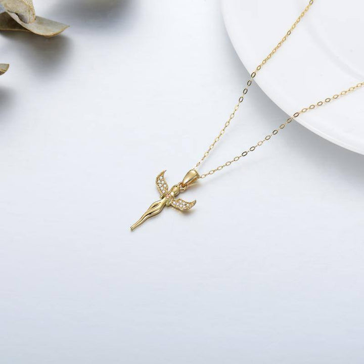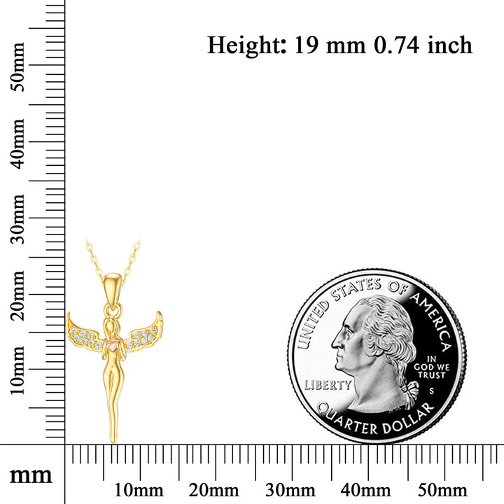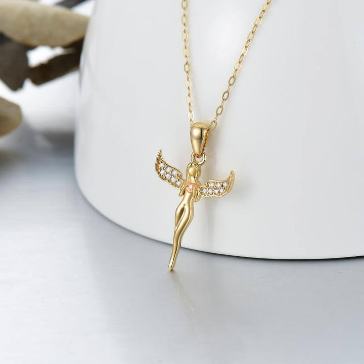 14K gold; cubic zirconia stones; angel wing and heart pendant; gold or rose gold finish; gold chain.