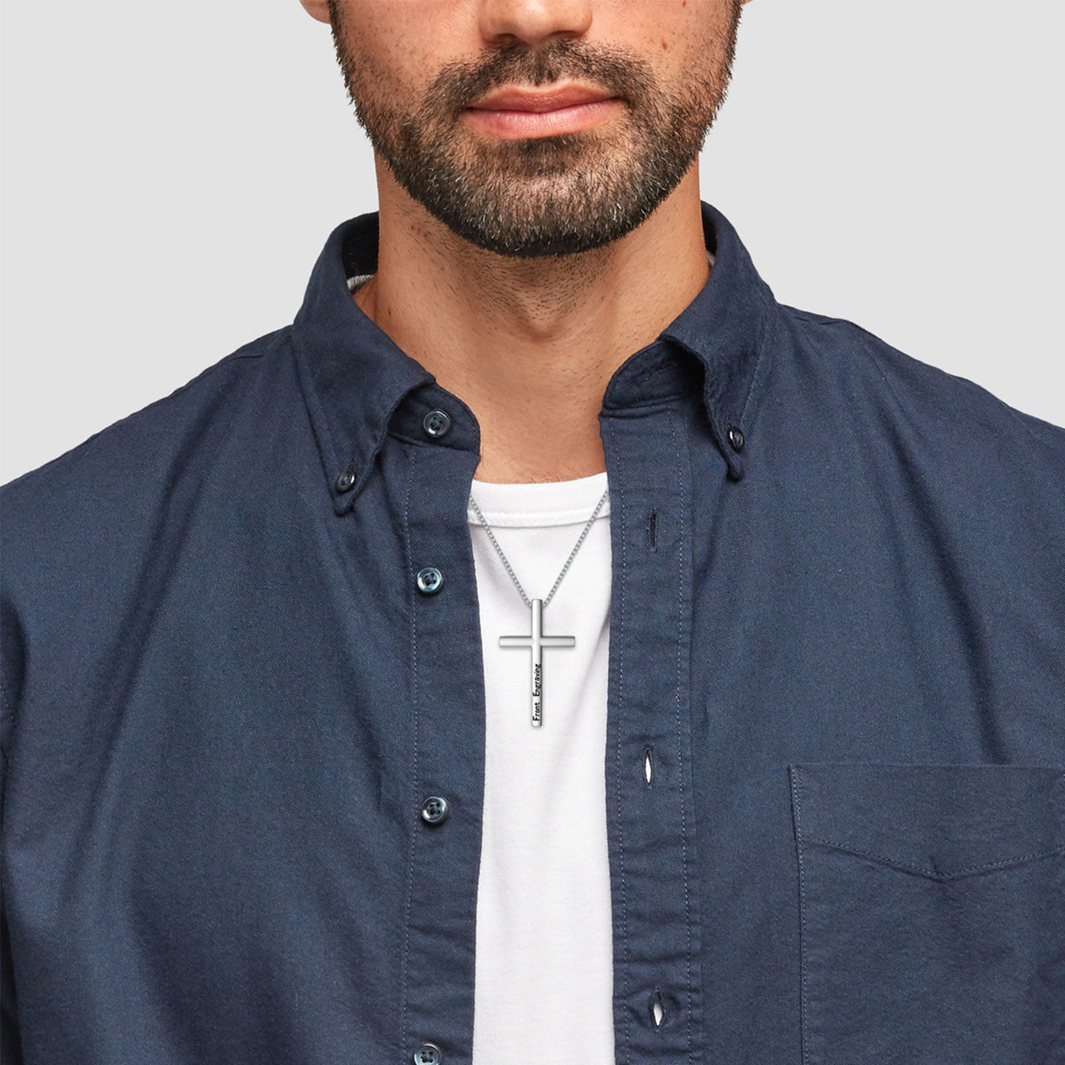 This no-stone Pendant Necklace is a Unisex Piece Crafted from Premium Sterling Silver with White Gold Plating, Featuring a Sleek Cross Design and Optional Personalized Engraving.