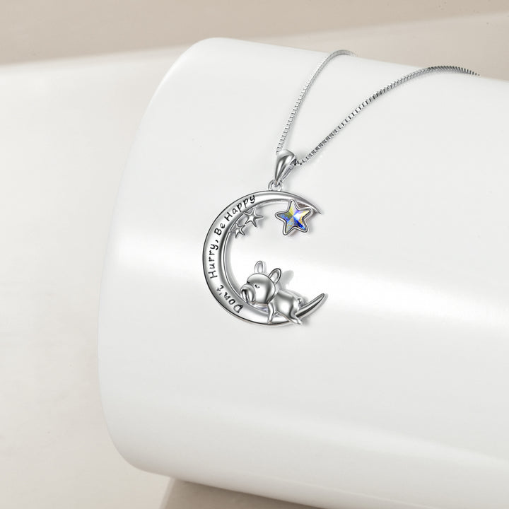 This Five-Pointed Star Crystal Dog Pendant Necklace by YFN is an enchanting accessory designed to inspire joy and tranquility. The white gold plated sterling silver pendant features a five-pointed star set with crystals, a playful dog, a moon, and stars. It carries the uplifting message "Don't Hurry, Be Happy," perfect for women who value elegance and a positive outlook.