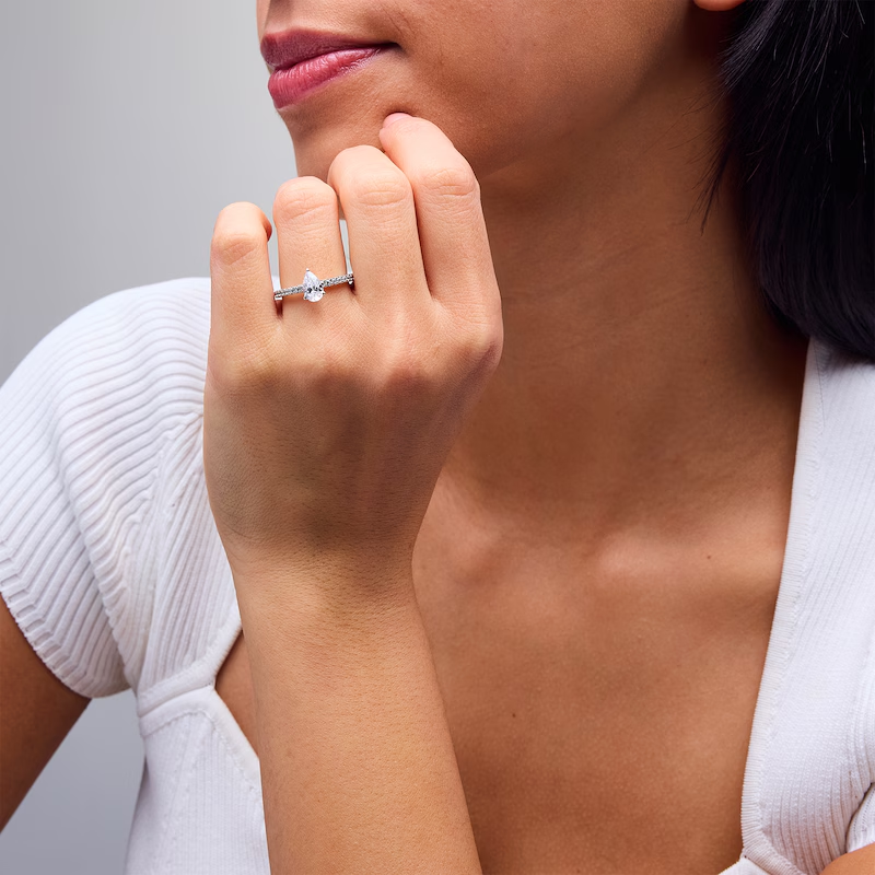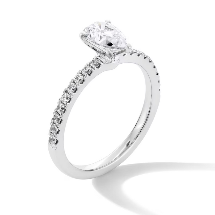 Sidestone engagement ring crafted from solid 14K white gold, featuring a pear-shaped lab-created diamond center stone (0.5 to 3 CT) and sidestones (total weight 1 to 3.5 CT). Diamond color D, clarity VVS1-VS1. IGI Certified. Features personalized engraving option.