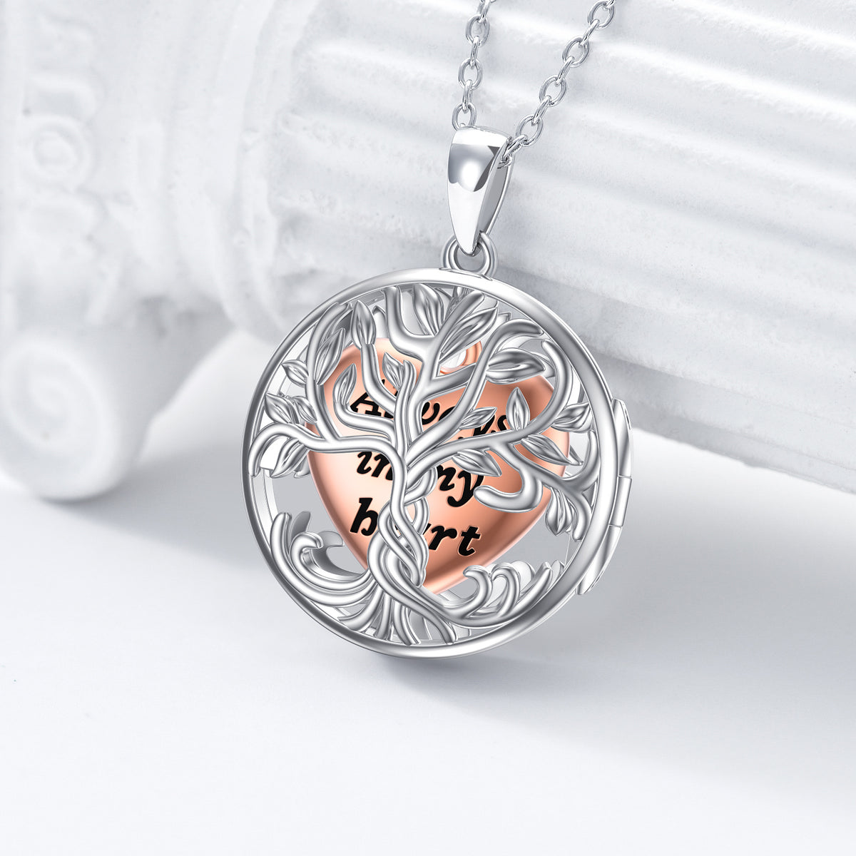 This no-stone Heart Shaped Urn Necklace for Ashes is crafted from Sterling Silver with Rose Gold Accents (Two-tone), Featuring a Tree of Life Motif and "Always In My Heart" Engraving.