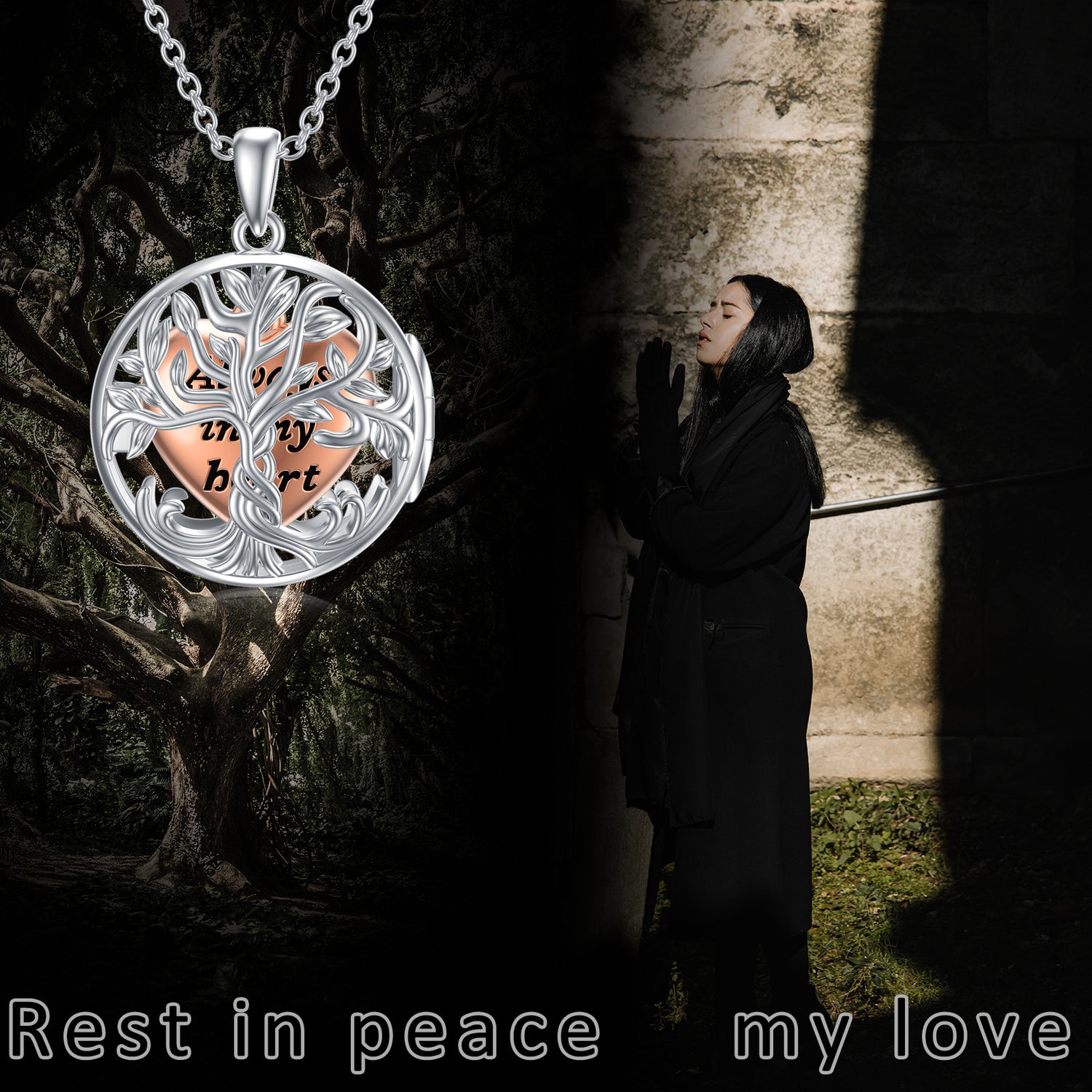 This Sterling Silver Two-tone Tree Of Life & Heart Urn Necklace for Ashes with Engraved Word by YFN is a no-stone, heart-shaped urn necklace for women, embodying eternal love and connection. Crafted from Sterling Silver with Rose Gold accents (Two-tone), the minimalistic design features a Tree of Life motif and an "Always In My Heart" inscription, providing a meaningful and stylish tribute to loved ones.