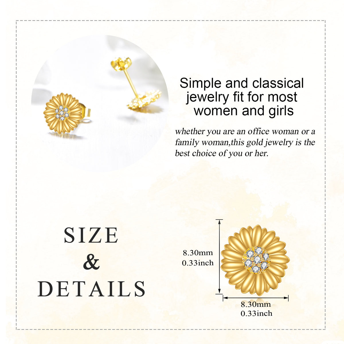 Handcrafted stud earrings made from 14K solid gold. Designed in a sunflower shape. Embellished with sparkling Cubic Zirconia stones.