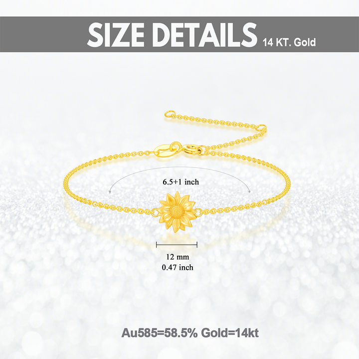 This 14K Gold Sunflower Charm Bracelet by YFN is designed exclusively for women who appreciate elegance and simplicity, embodying the warmth of nature. Crafted from high-quality 14K gold with no stones, this charm bracelet features a delicate sunflower design that symbolizes joy and positivity. Its minimalist style allows for versatility, seamlessly transitioning between casual and formal looks, making it a comfortable, cherished, and timeless accessory for daily wear or special events.