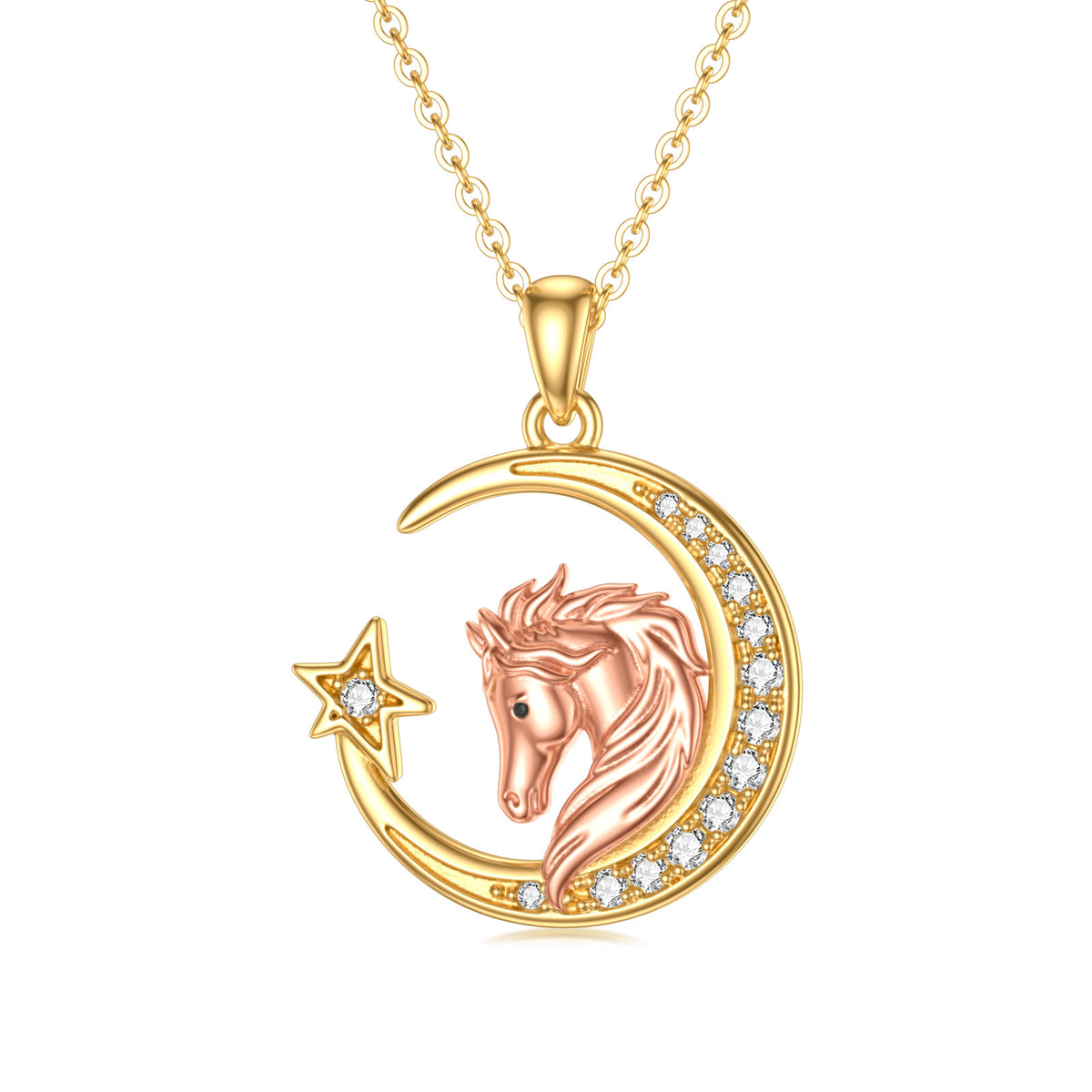 14K Gold & Rose Gold Round Moissanite Horse With Moon Star Pendant Necklace For Women