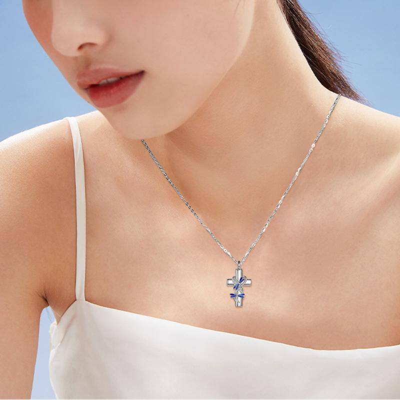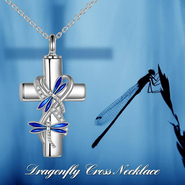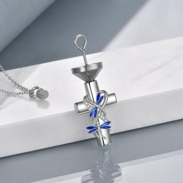 Sterling Silver Round Zircon Dragonfly & Cross Urn Necklace for Ashes with Engraved Word