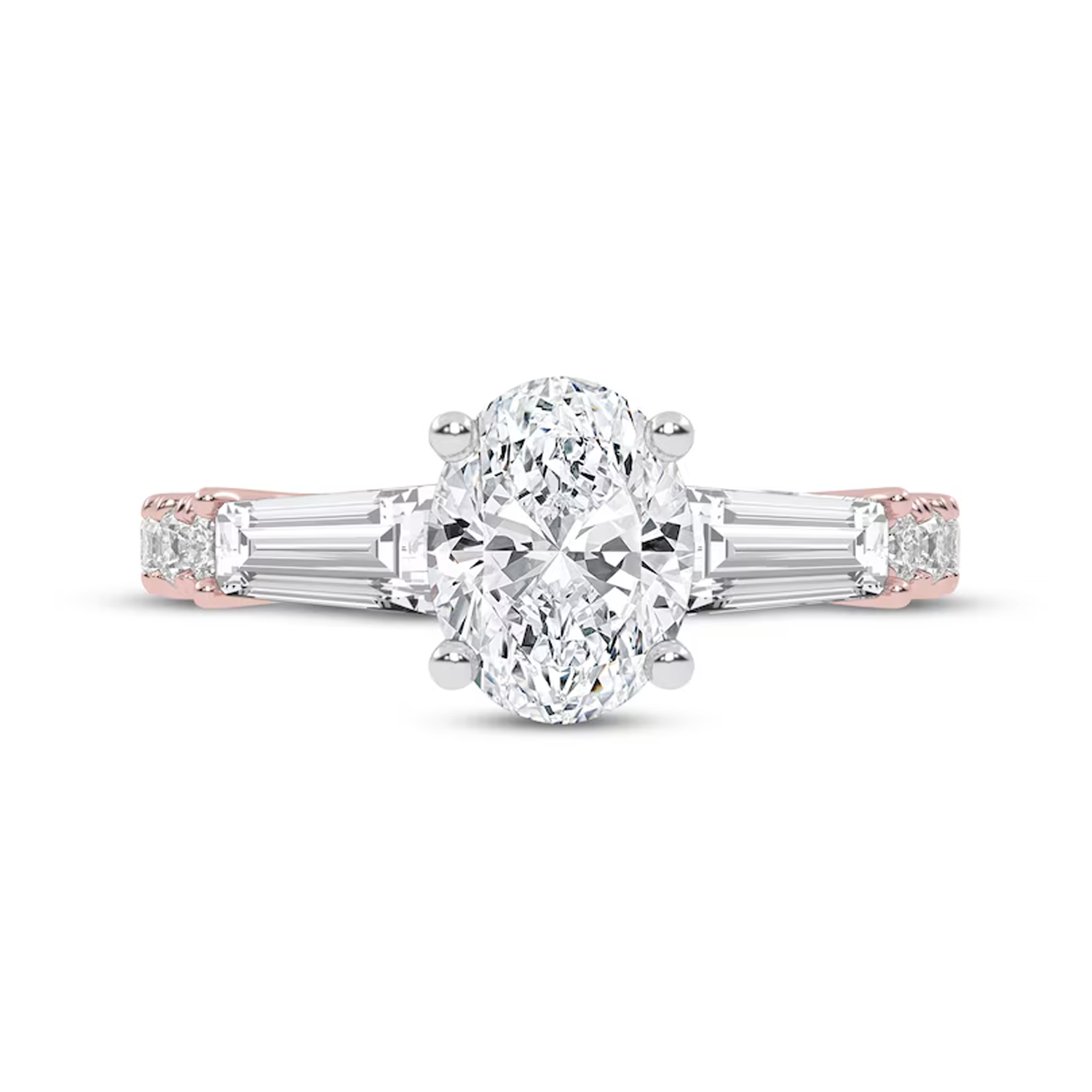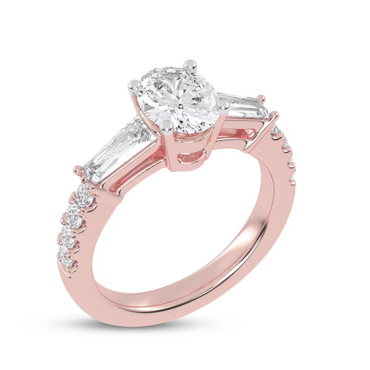 This engagement ring is crafted from elegant 14K rose gold. It features a round-cut IGI Certified lab created diamond center stone (1 to 3.5 CT. T.W. total), boasting D color, VVS1-VS1 clarity, and 3EX cut, polish, and symmetry.