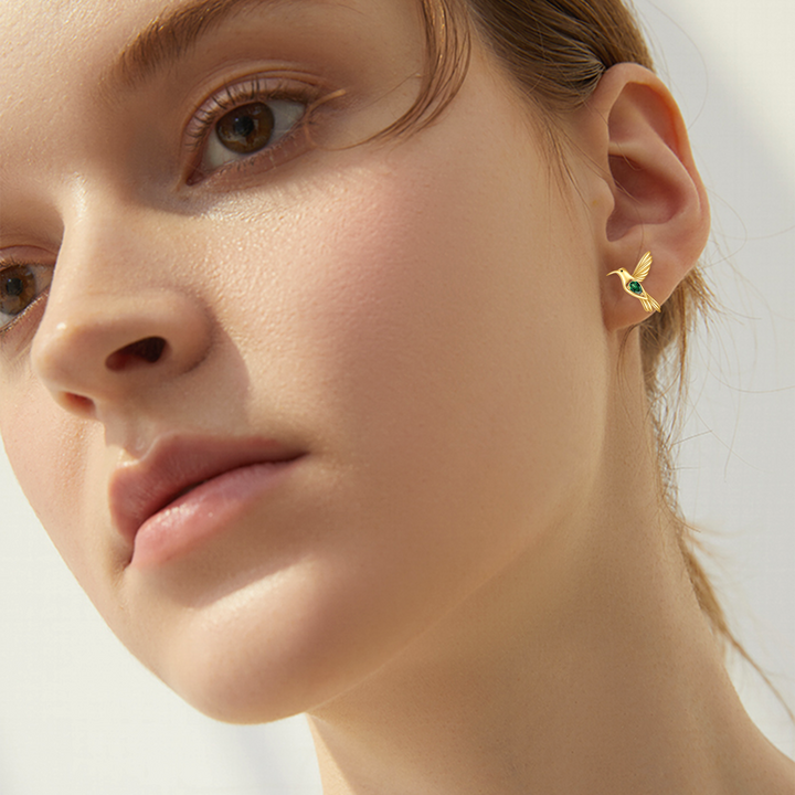 Handcrafted stud earrings made from 14K solid gold. Features a hummingbird motif. Embellished with sparkling Cubic Zirconia stones.