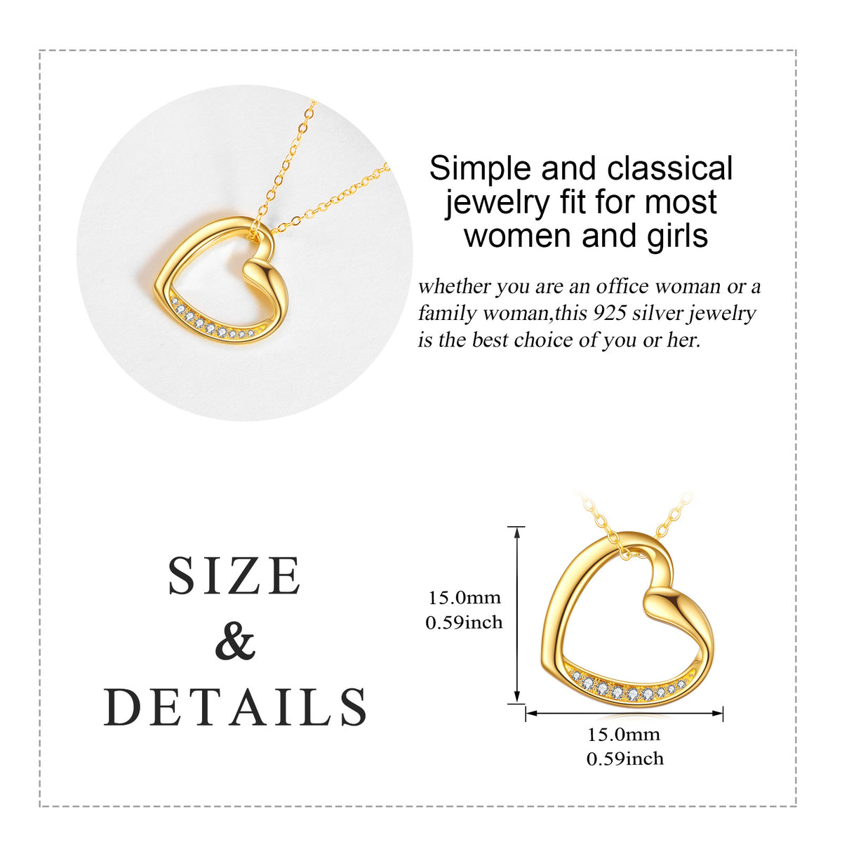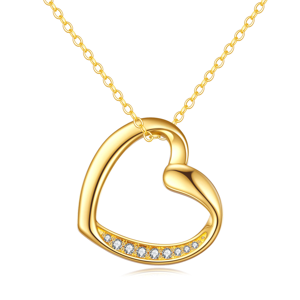 14K gold; cubic zirconia; heart-shaped pendant; gold chain.