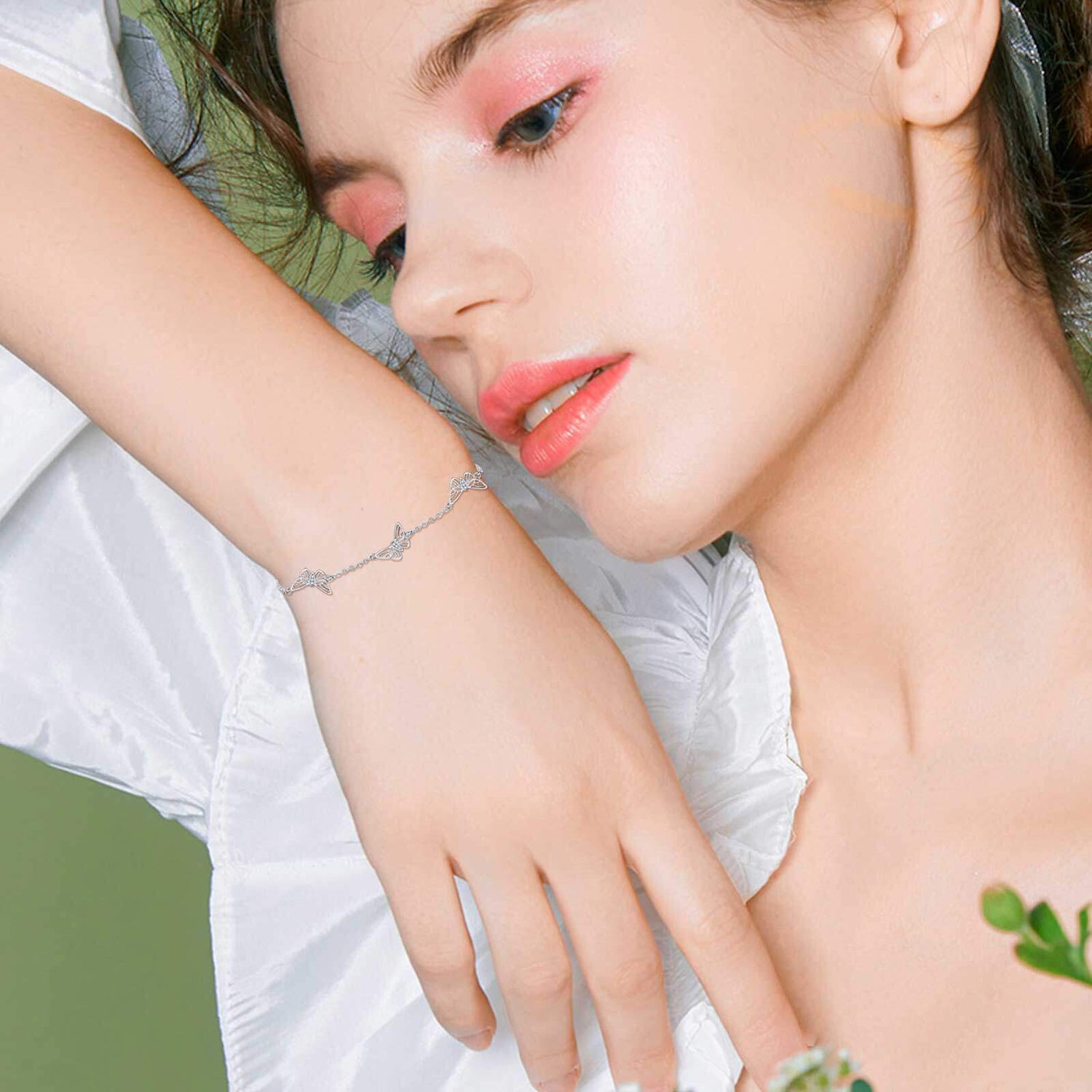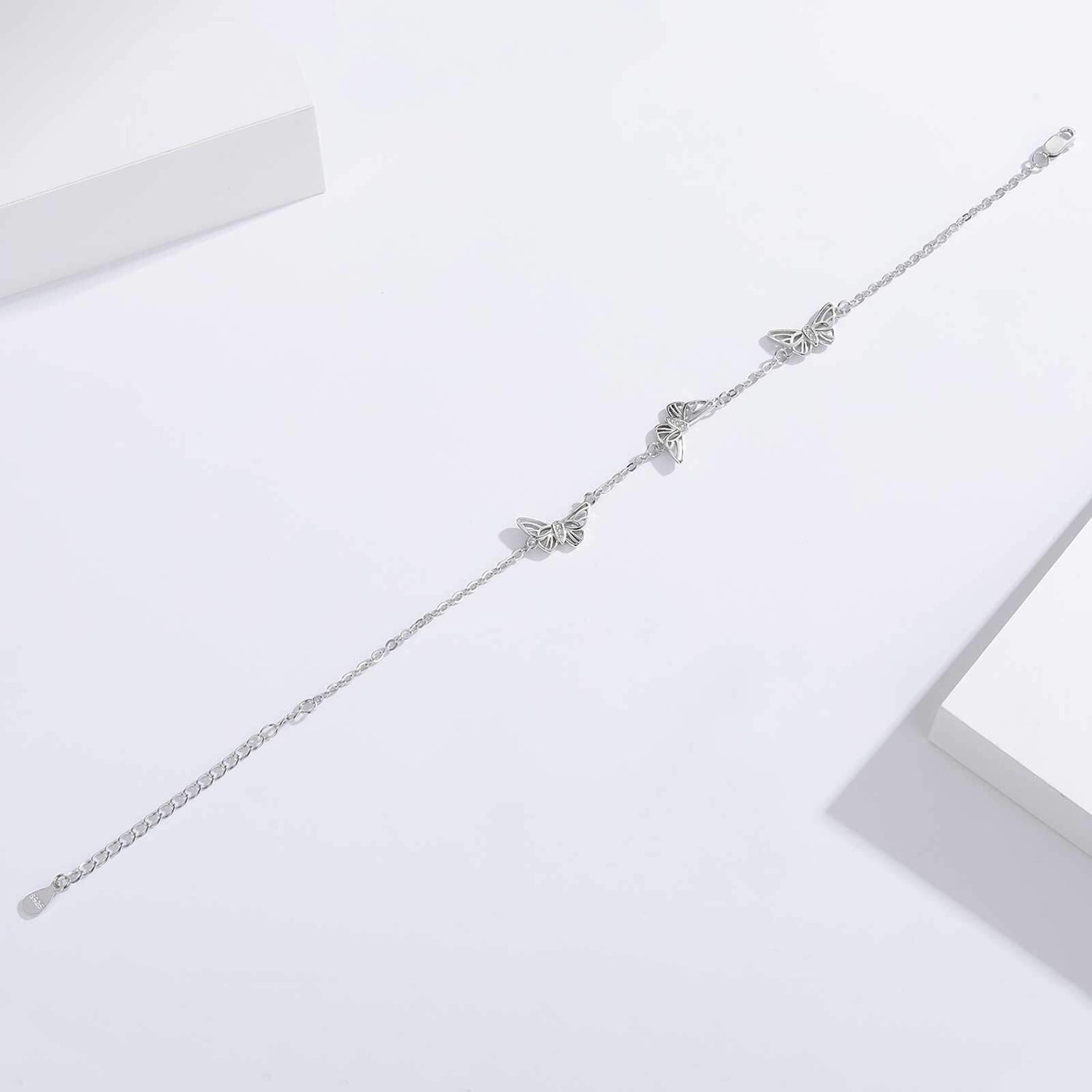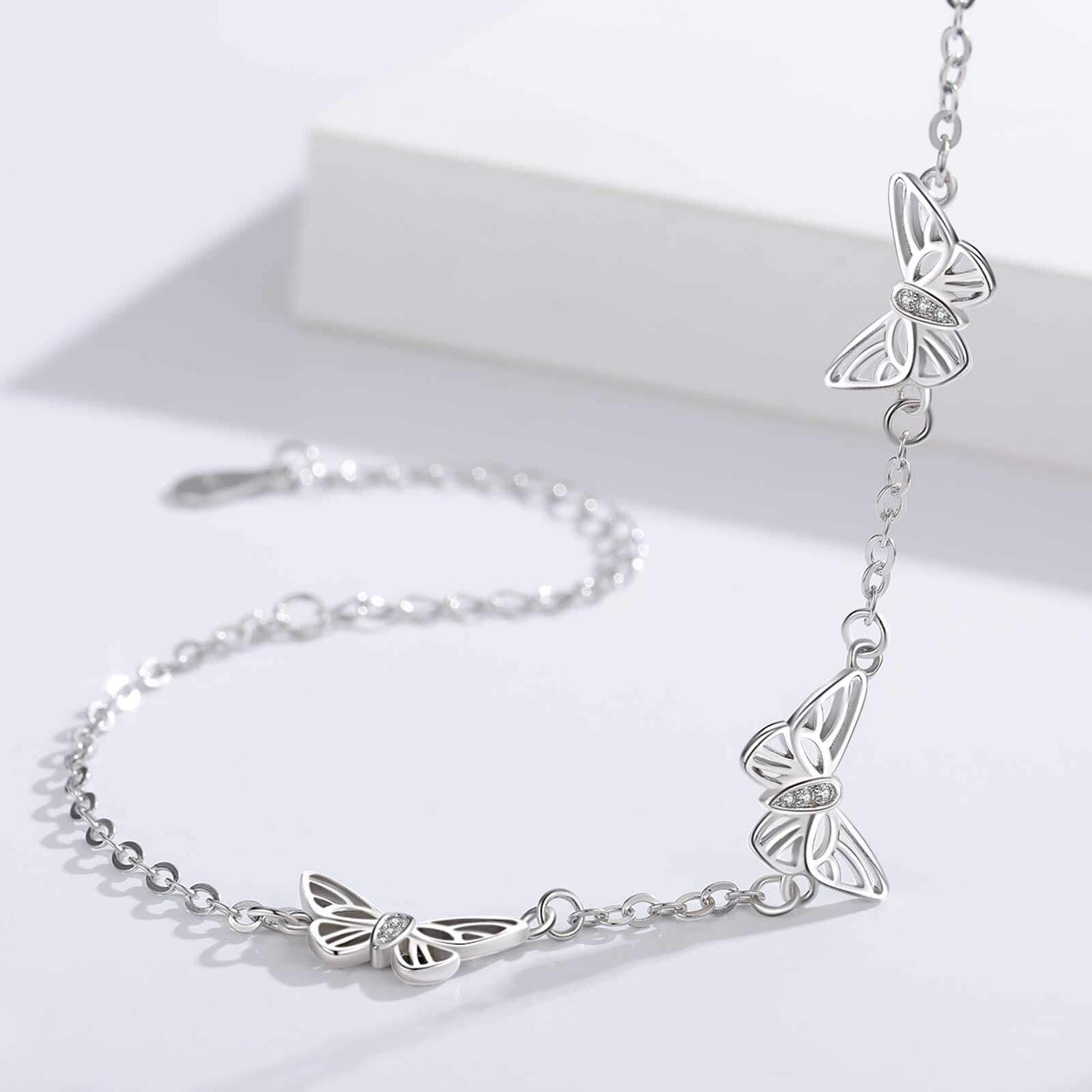Sterling silver; white gold plating; cubic zirconia; butterfly charm; bracelet chain.