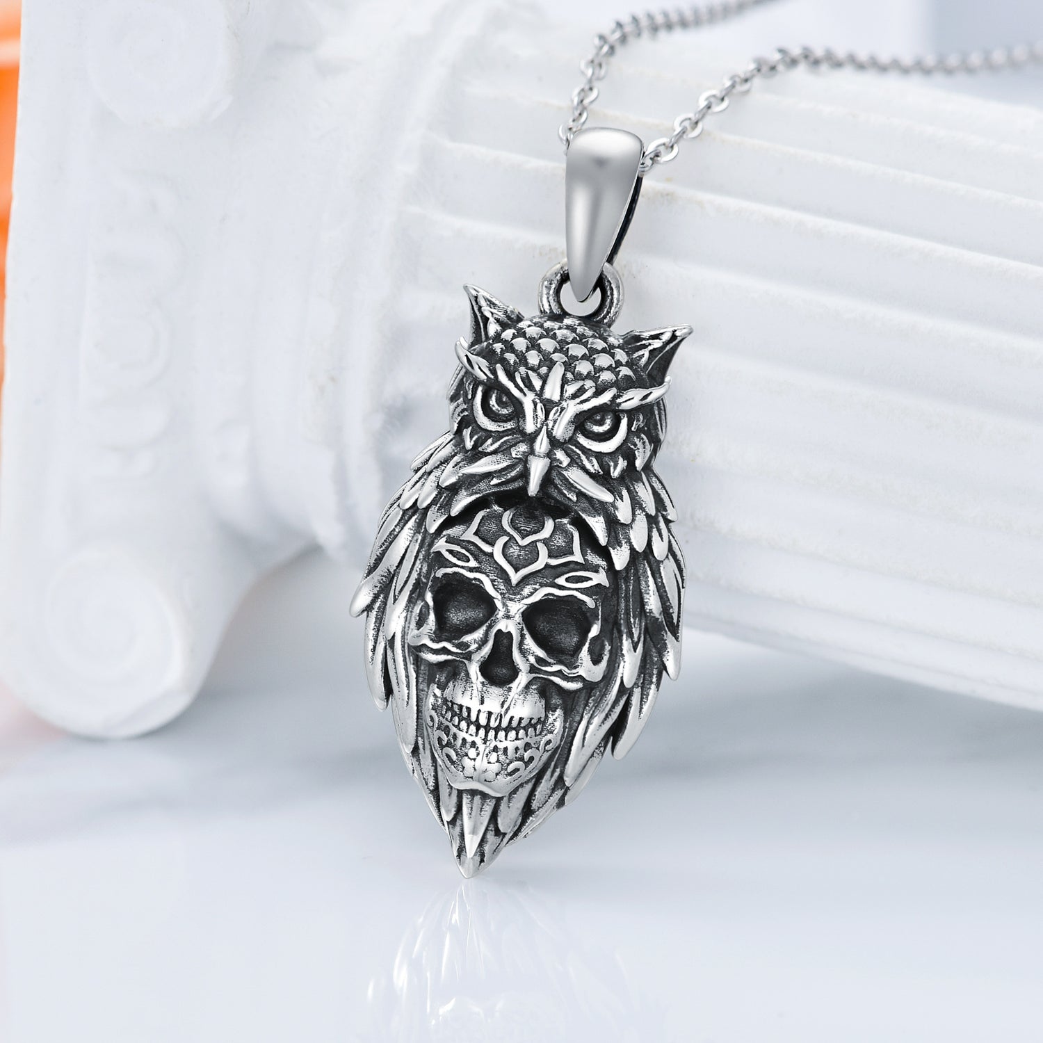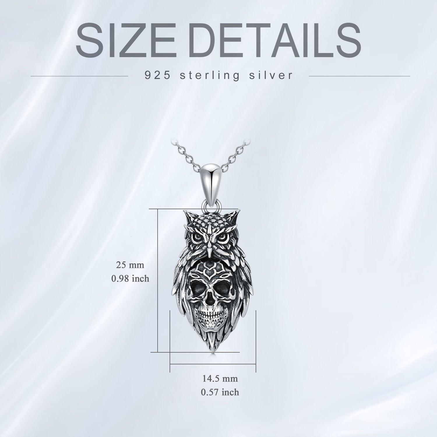 Sterling silver; owl and skull pendant; retro silver finish; silver chain.