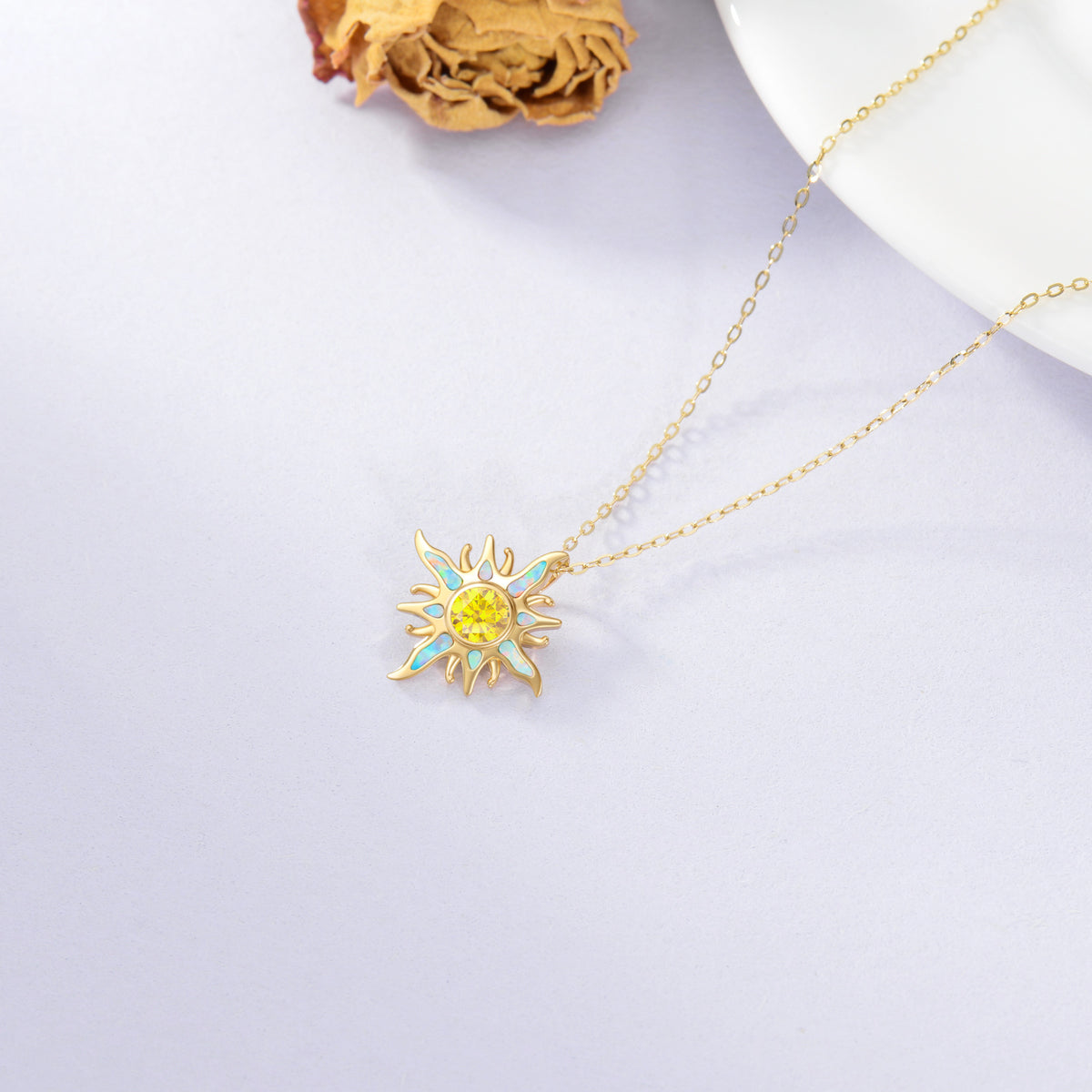 This 14K Gold Cubic Zirconia & Opal Sun Pendant Necklace captures the essence of the sun's radiant energy. The mesmerizing Yellow Opal centerpiece is encircled by dazzling Cubic Zirconia stones in 14K Gold, bringing a touch of warmth and luxury to your ensemble.