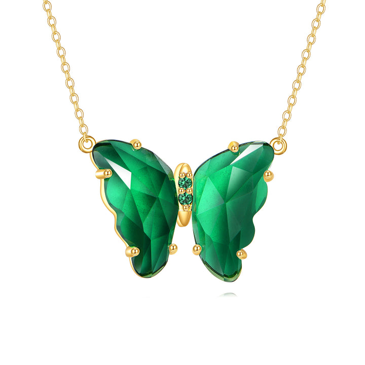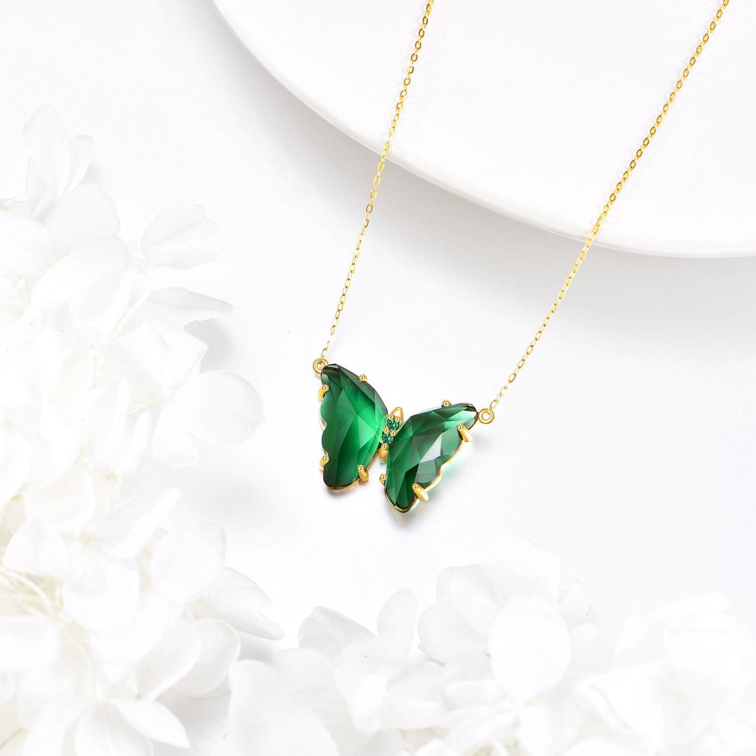 This Butterfly Pendant Necklace is Crafted from Premium 14K Gold, adorned with Sparkling Cubic Zirconia and a Stunning Emerald Centerpiece.