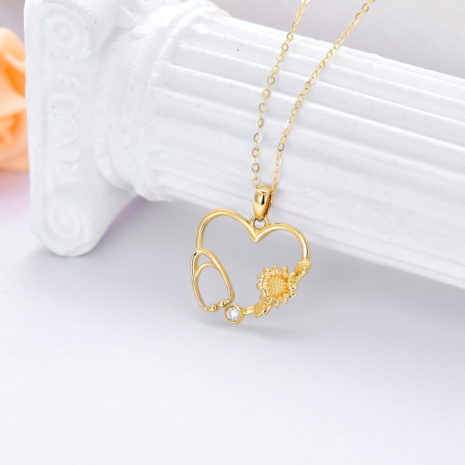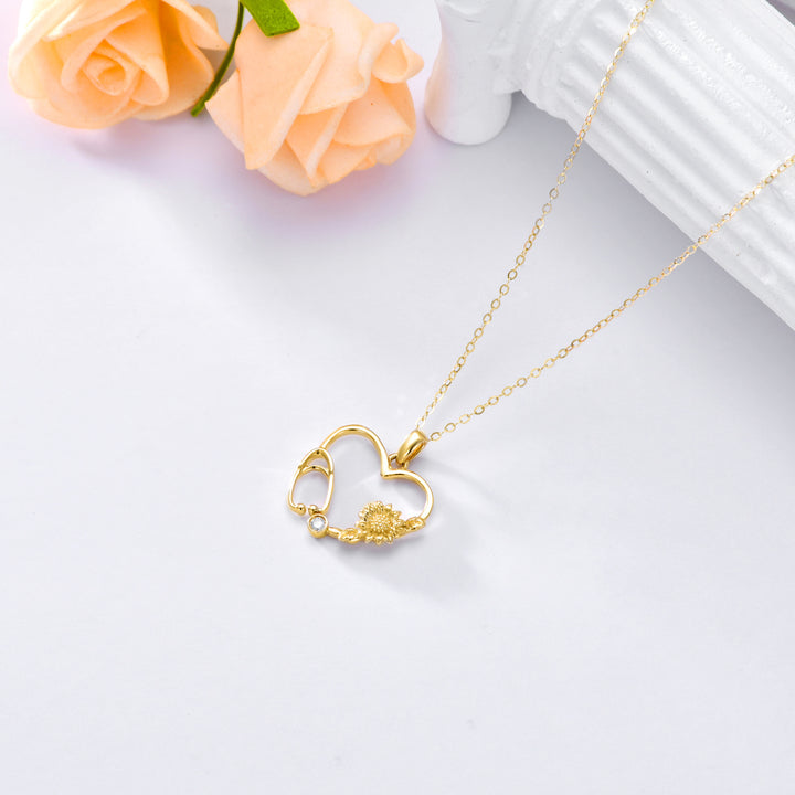 14K Gold Moissanite Sunflower & Heart & Stethoscope Pendant Necklace