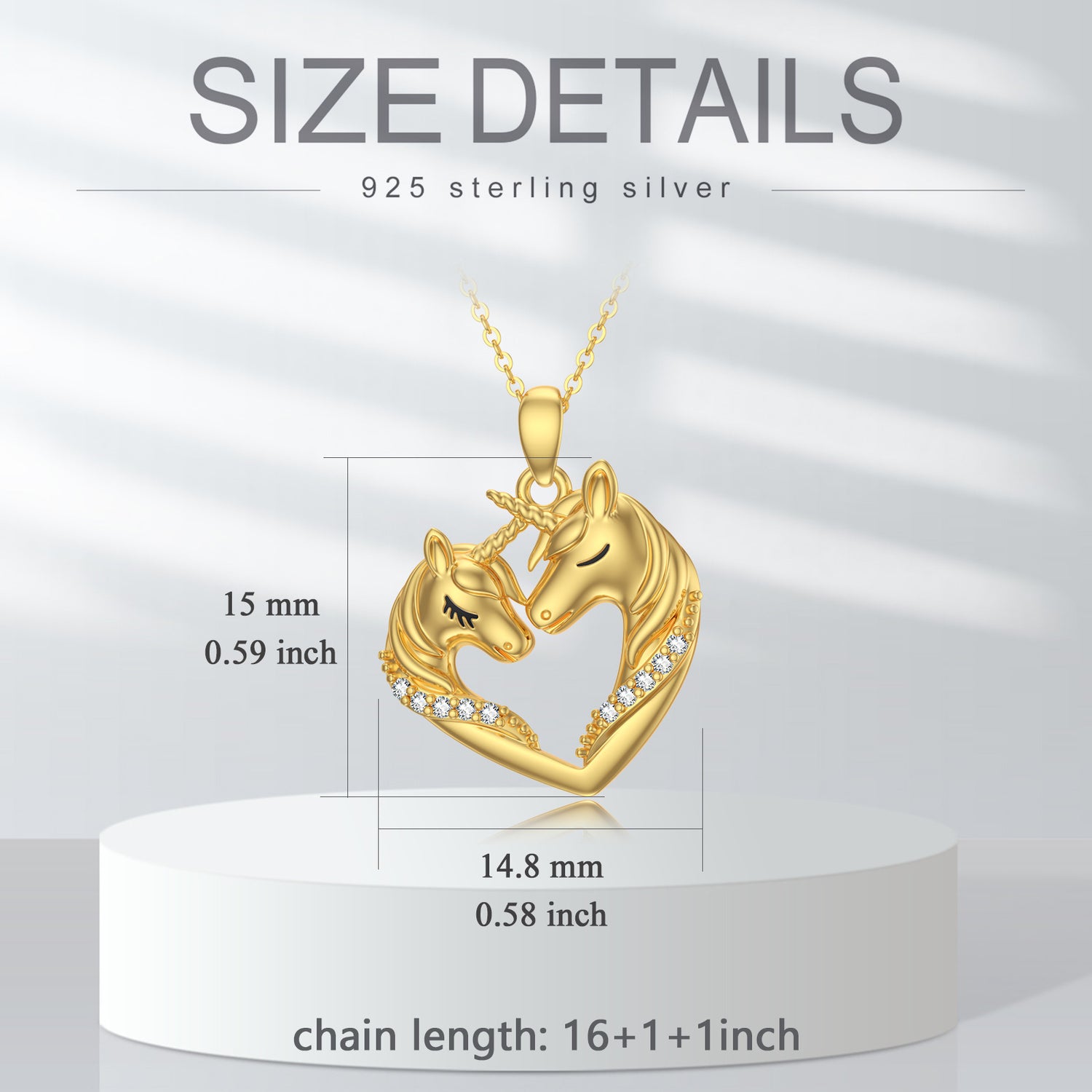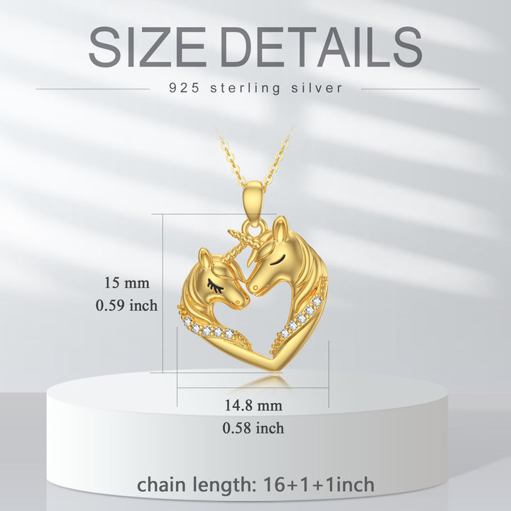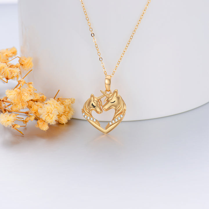 14K gold; Cubic Zirconia; unicorn and heart motifs; pendant with chain.
