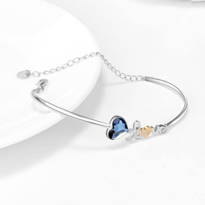 This Sterling Silver Two-Tone Heart Crystal Pendant Bangle With Engraved Word for Women by YFN radiates emotional elegance with its heart-shaped pendant encrusted in dazzling blue crystals. Designed for women who appreciate meaningful jewelry, the piece symbolizes affection, serenity, and timeless charm. The two-tone finish—offered in both white gold and yellow gold plating—adds luxurious versatility, allowing seamless pairing with any wardrobe. Crafted with a durable sterling silver base, this bracelet blends sparkle with sophistication, making it perfect for gifting or personal expression. Its thoughtful craftsmanship and modern appeal elevate it as a cherished keepsake.