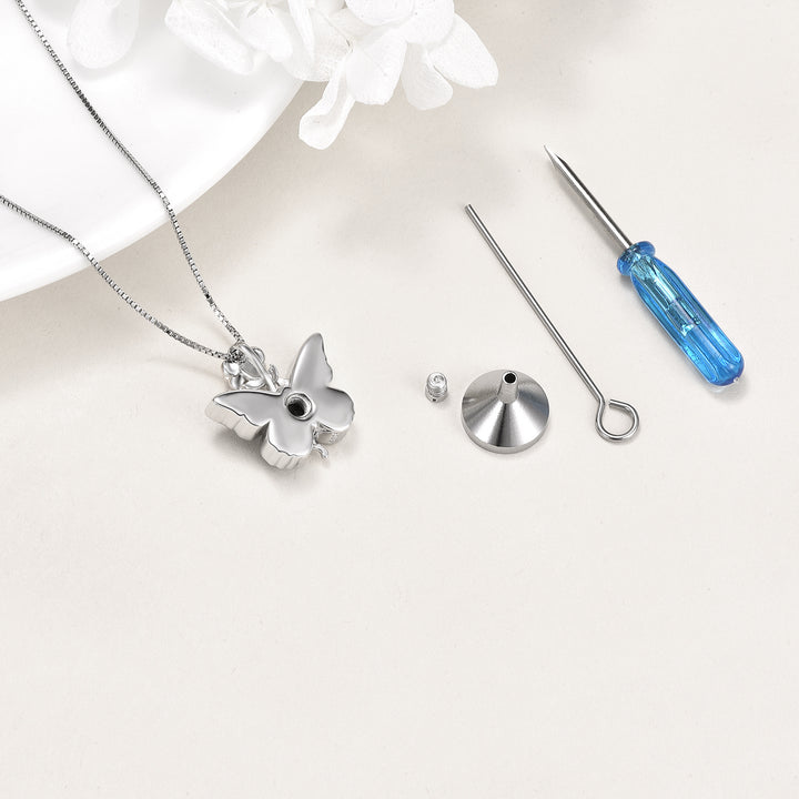 Sterling Silver Two-tone Circular Shaped Cubic Zirconia Butterfly & Rose Urn Necklace for Ashes