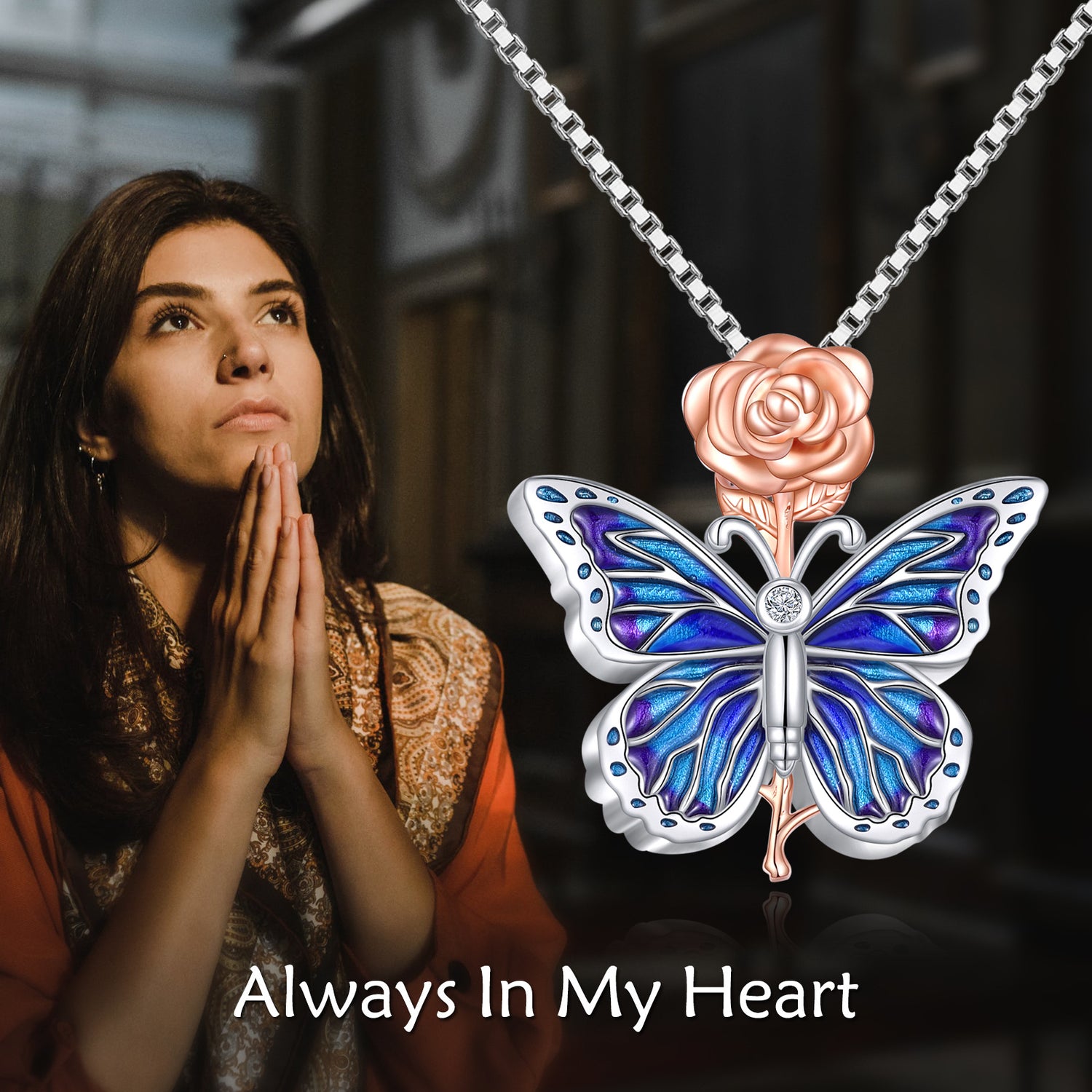 Cremation urn necklace in sterling silver, two-tone (silver and rose gold) plated, circular shape. Set with round clear Cubic Zirconia stones. Features butterfly and rose motifs. Pendant measures 1.0 inch by 0.85 inches on an 18-inch rolo chain with a spring-ring clasp.