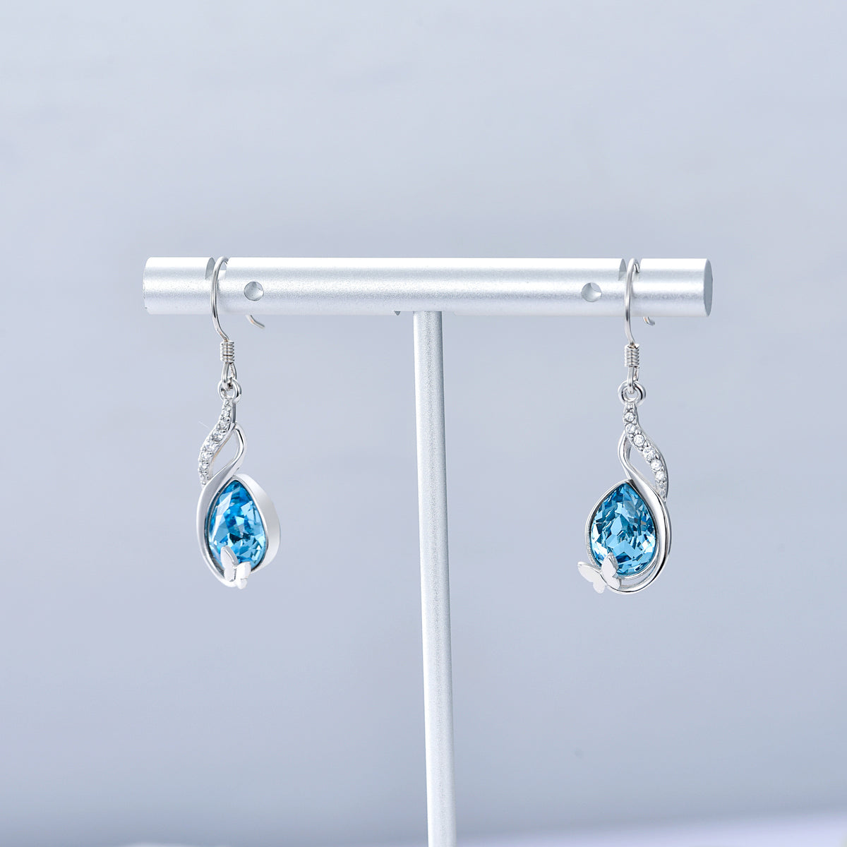 Sterling silver with white gold plating; crystals; butterfly design; drop earring style.