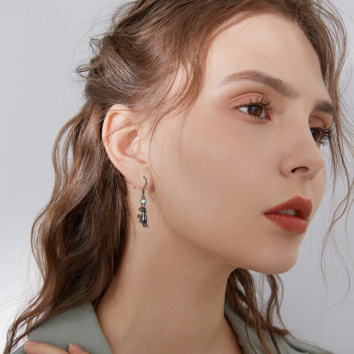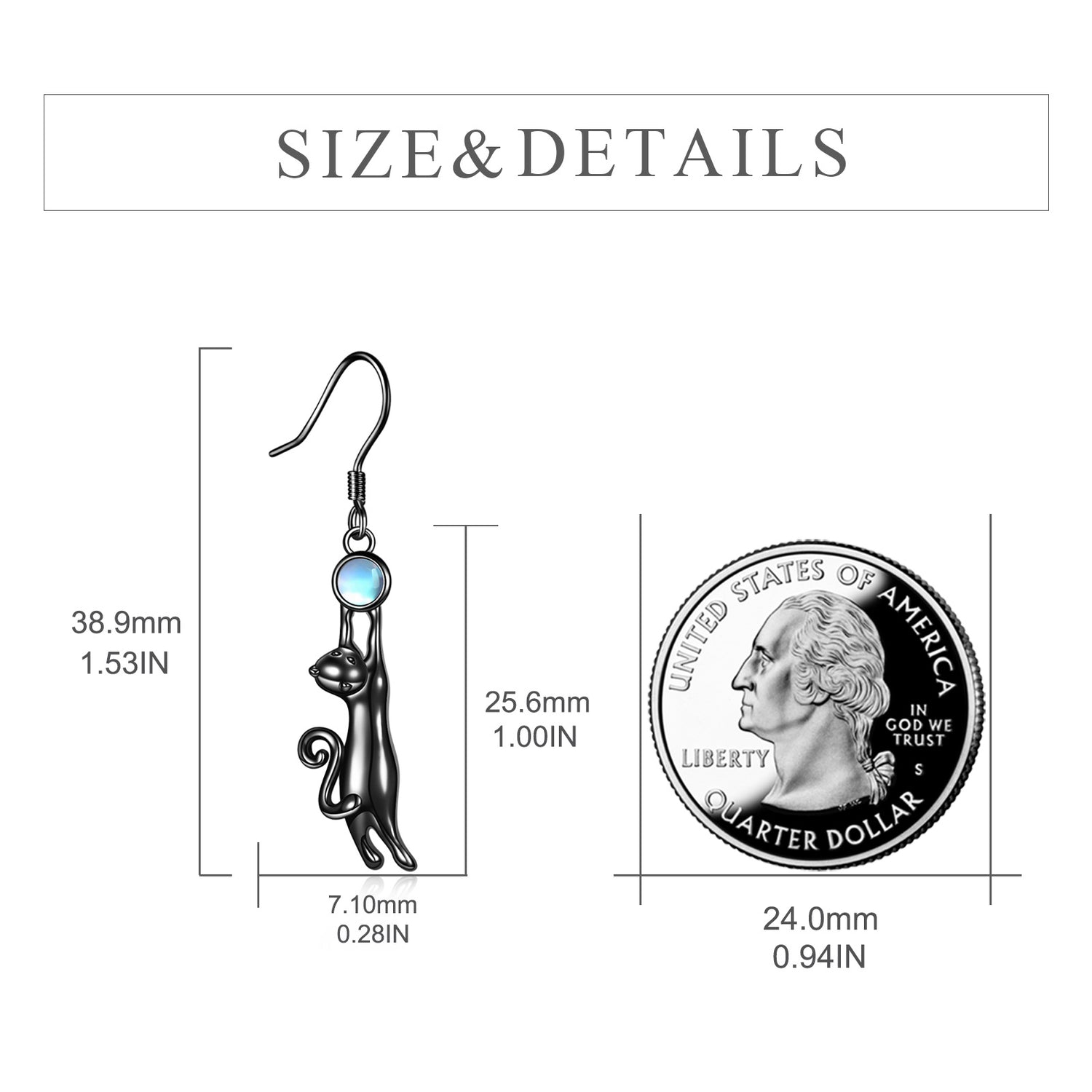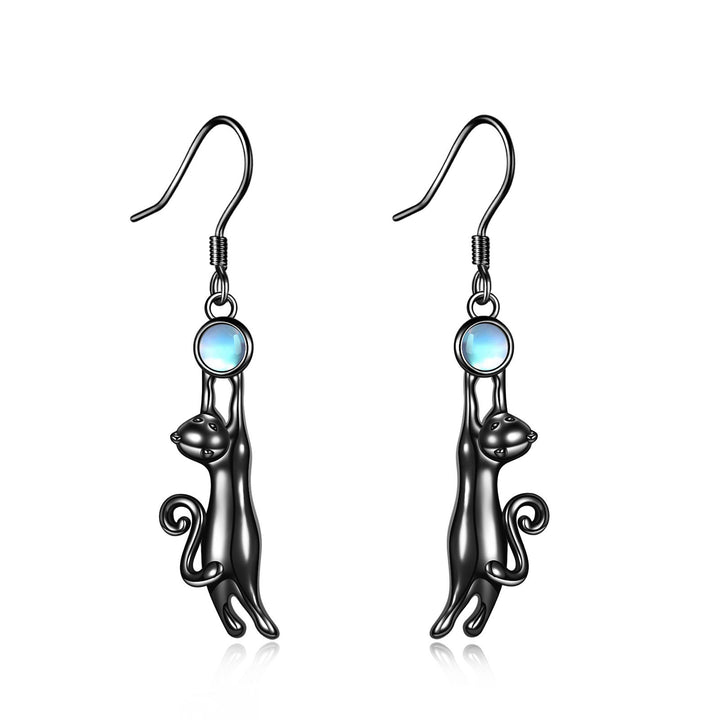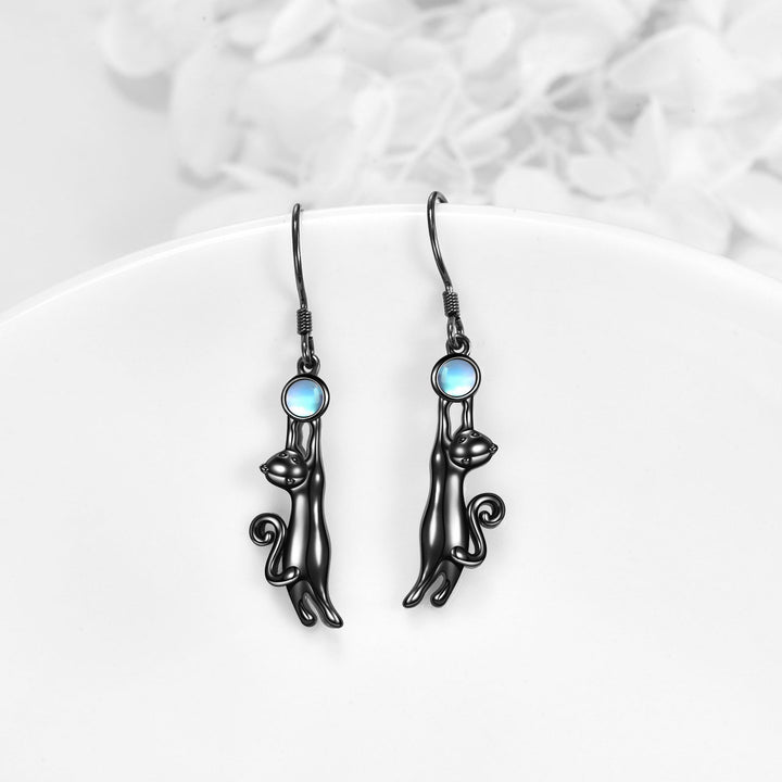 Crafted from high-quality Sterling Silver, these circular Drop Earrings feature a Moonstone and a Cat design, finished with a Black Rhodium Color.