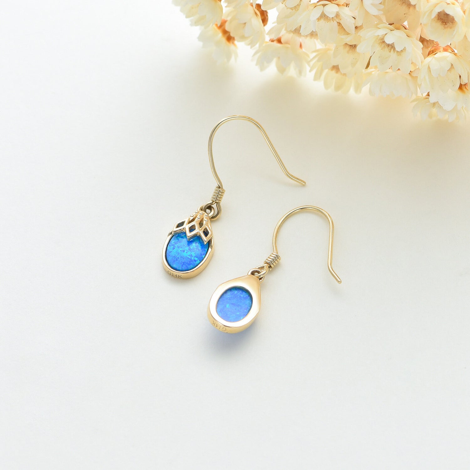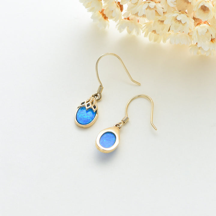 These Drop Earrings are crafted from Genuine 14K Solid Gold, Featuring Dazzling Blue Opal Gemstones in a Drop Shape.