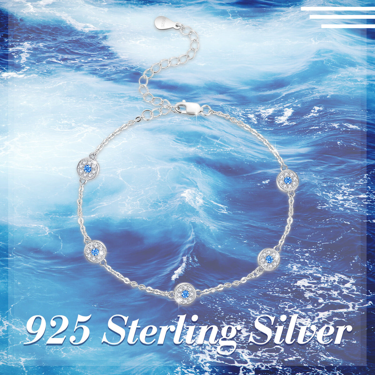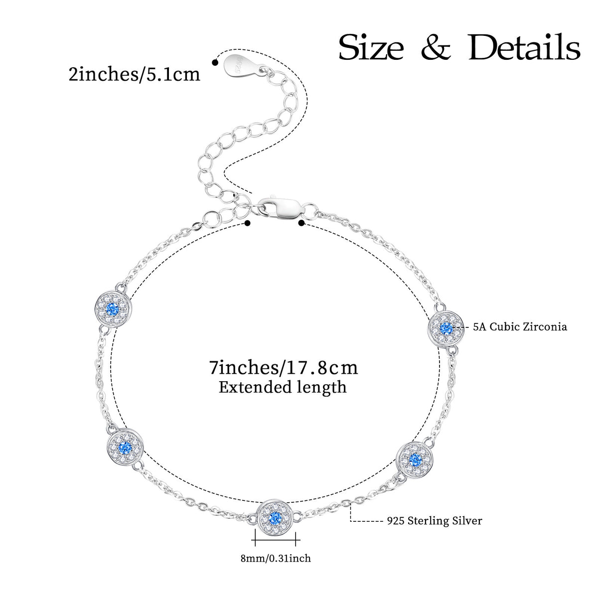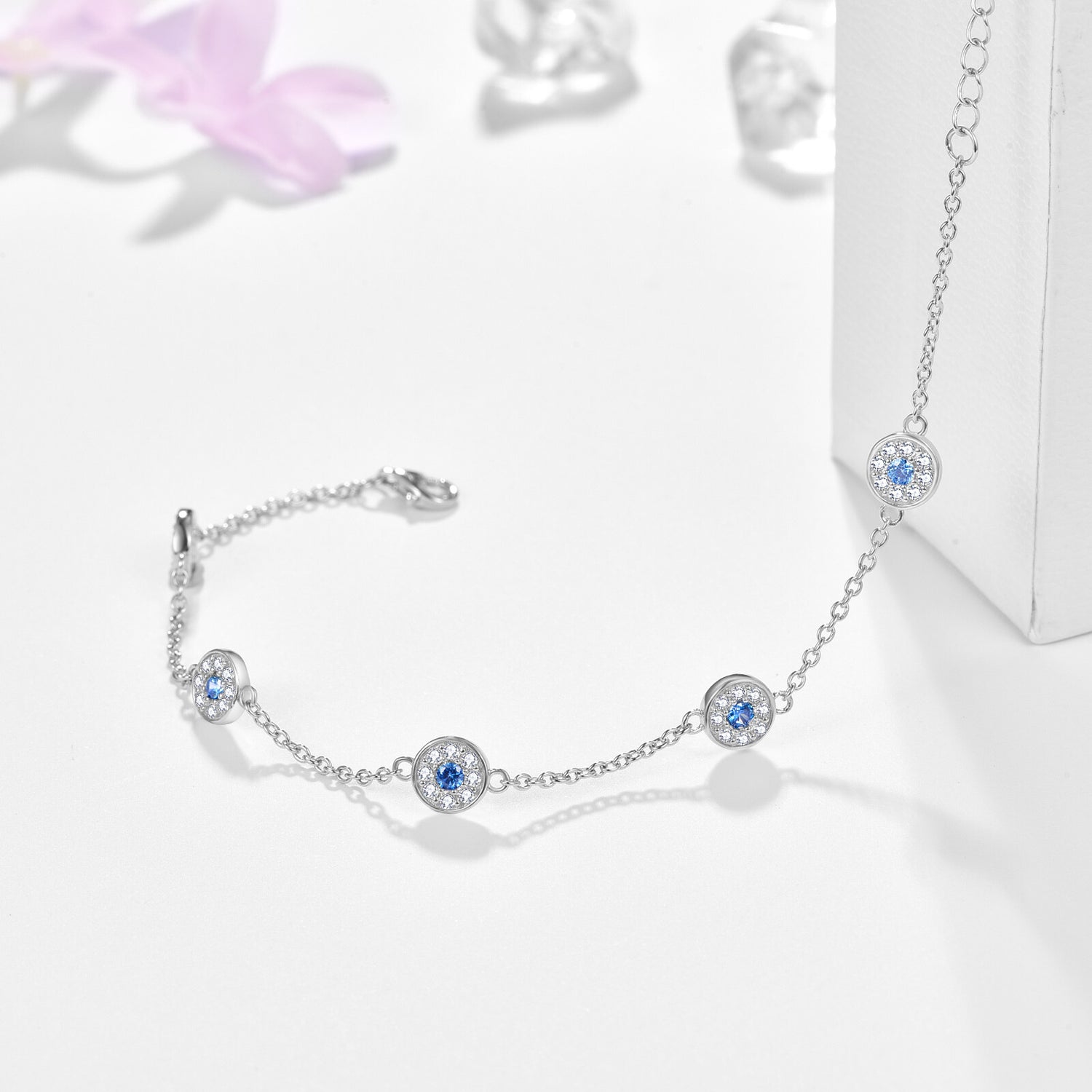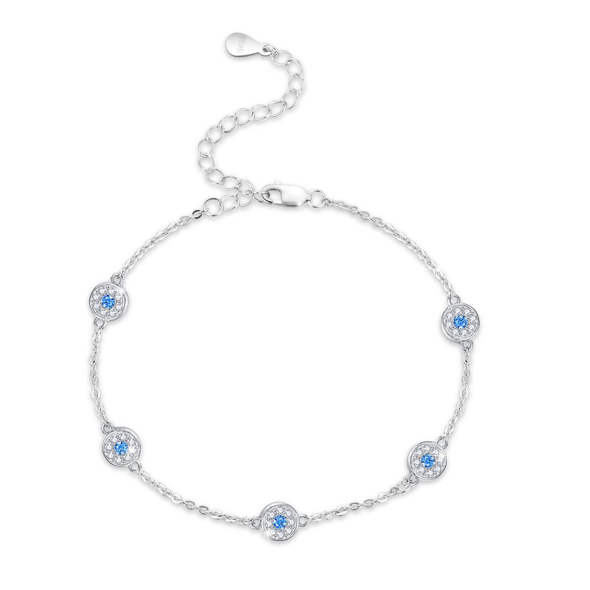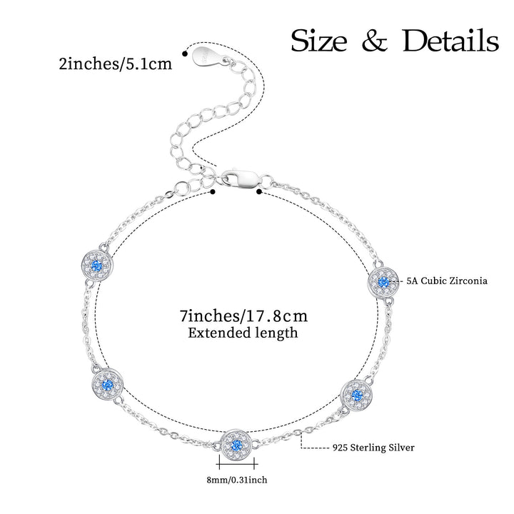 This Sterling Silver Circular Shaped Cubic Zirconia Evil Eye Bead Station Chain Bracelet by YFN is an exquisite bead station chain bracelet for women. Crafted from Sterling silver and plated in white gold, it features circular-shaped blue and clear Cubic zirconia stones that form a stunning evil eye design, symbolizing protection and elegance.