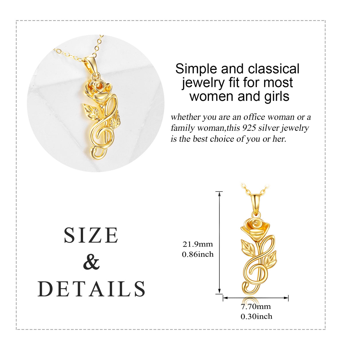 This no-stone Women's Pendant Necklace is crafted from High-Quality 14K Gold, Featuring an Intricate Rose and Music Symbol Design.
