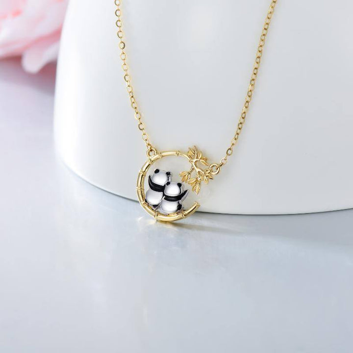 This pendant necklace is crafted from Solid 14K Gold and features a panda and bamboo motif pendant, suspended from a matching gold chain.