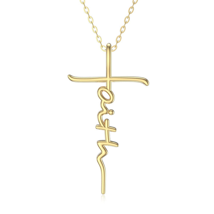 This 14K Gold Handwriting Faith Cross Pendant Necklace by YFN is a timeless piece that embodies grace and profound symbolism. Crafted for women, this exquisite no-stone Cross Pendant is made from luxurious 14K Gold. Its minimalist, handwritten style ensures versatility, allowing it to seamlessly complement any outfit, from casual to formal. This elegant piece is a testament to refined taste and spiritual significance, perfect for daily wear or special occasions.
