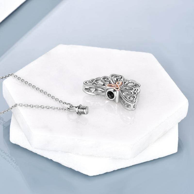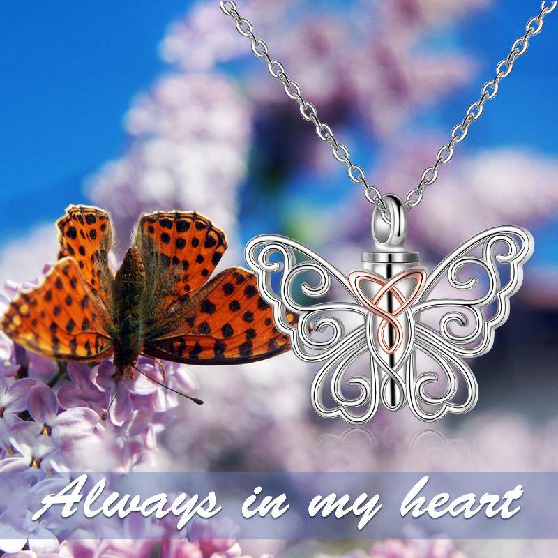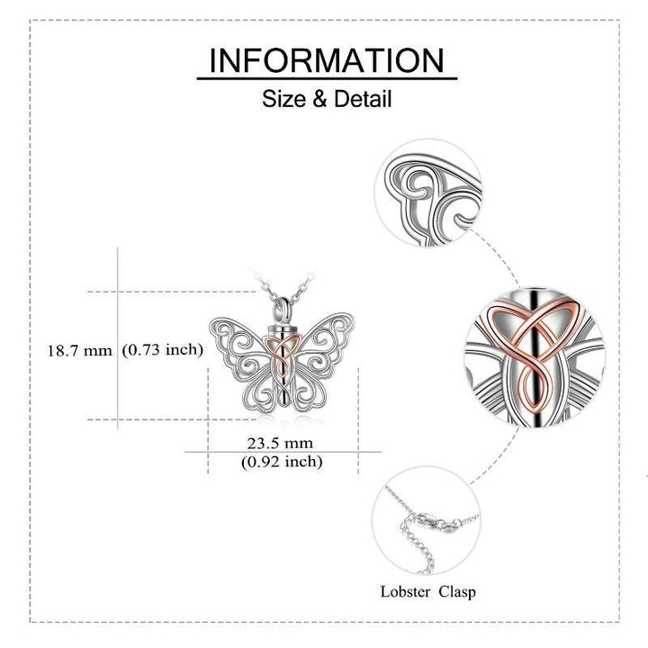 Crafted from Sterling Silver in Silver and Rose Gold (Two-tone), featuring an Urn Necklace for Ashes with Butterfly and Celtic Knot Designs.