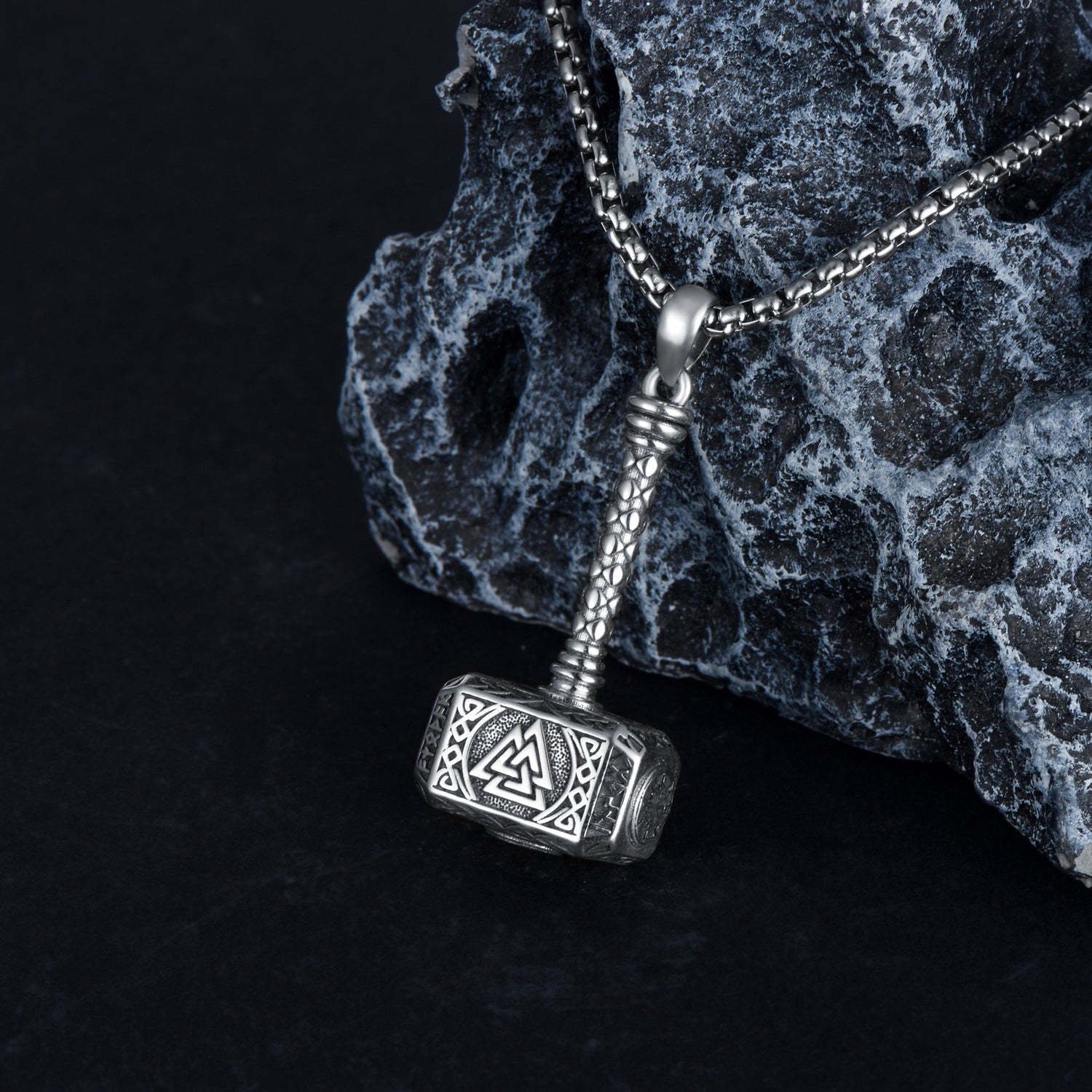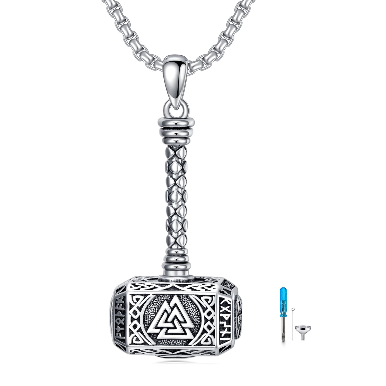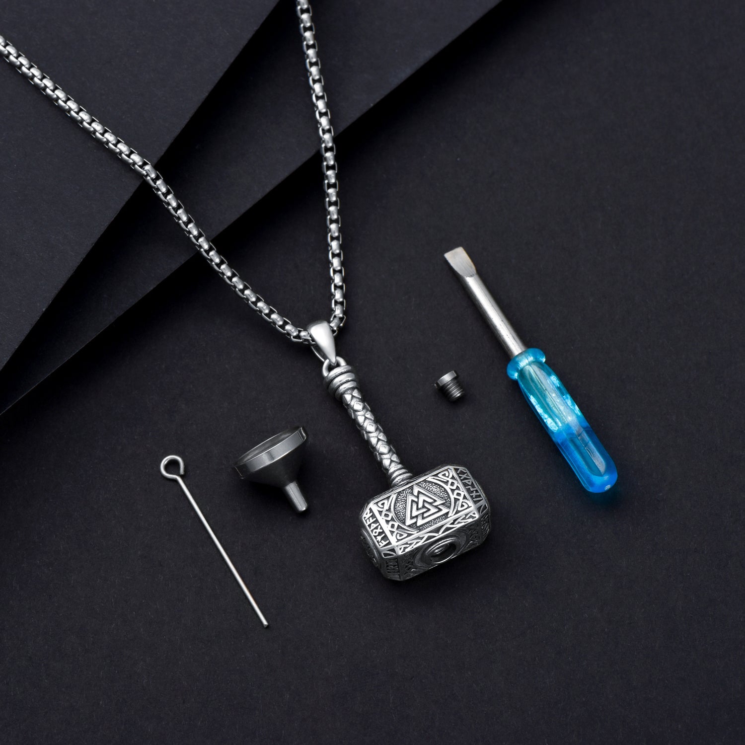 Forged from premium Sterling Silver with a Retro Silver finish, this no-stone Men's Urn Necklace features a Thor's Hammer design.