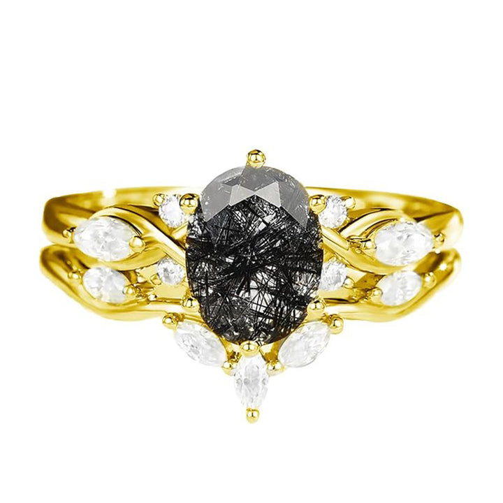 18K Gold Oval-Cut Black Rutilated Quartz Moissanite Engagement Ring